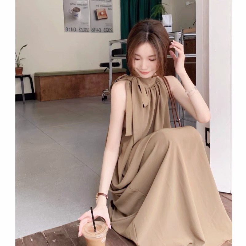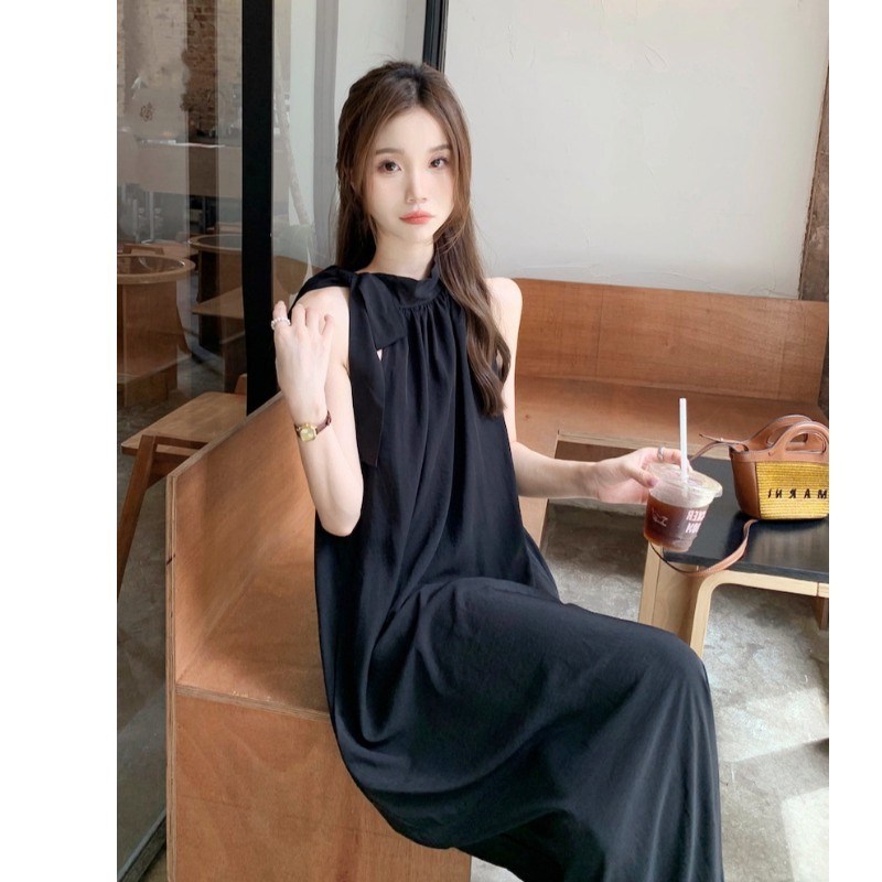 法式高端气质挂脖露肩绑带连衣裙女夏季2024新款无袖背心垂感长裙