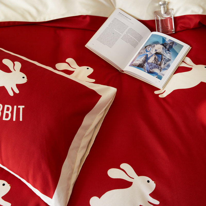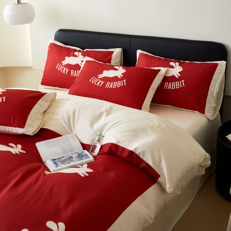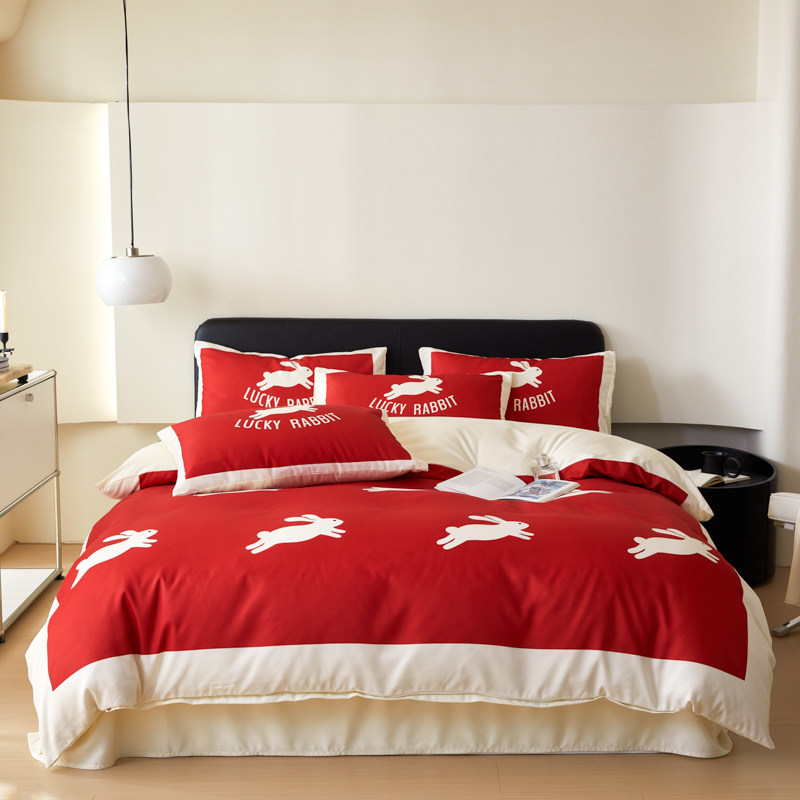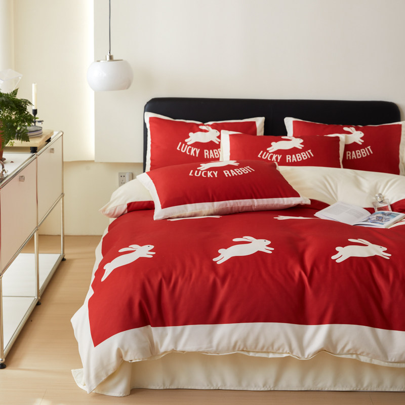 网红风毛巾绣红色兔年四件套床单被套兔子床上用品床笠款结婚婚庆