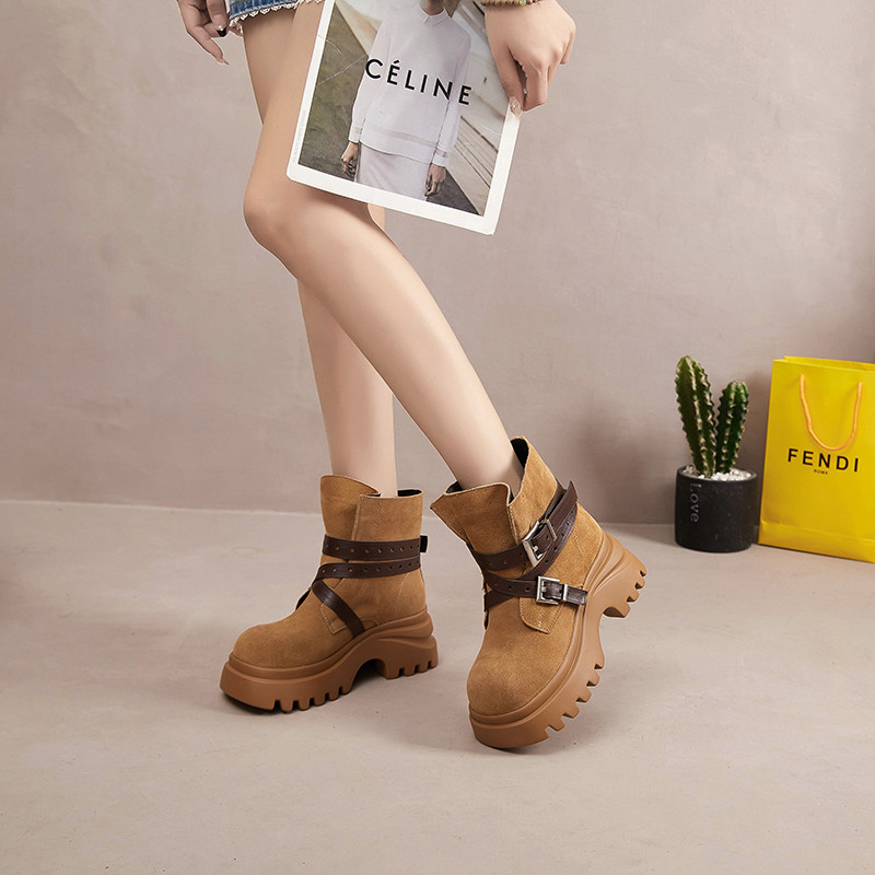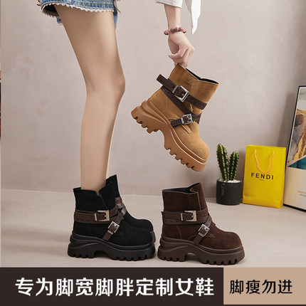 加肥加宽大码女鞋皮带磨砂牛皮双扣秋冬款马丁靴厚底加绒JW58211
