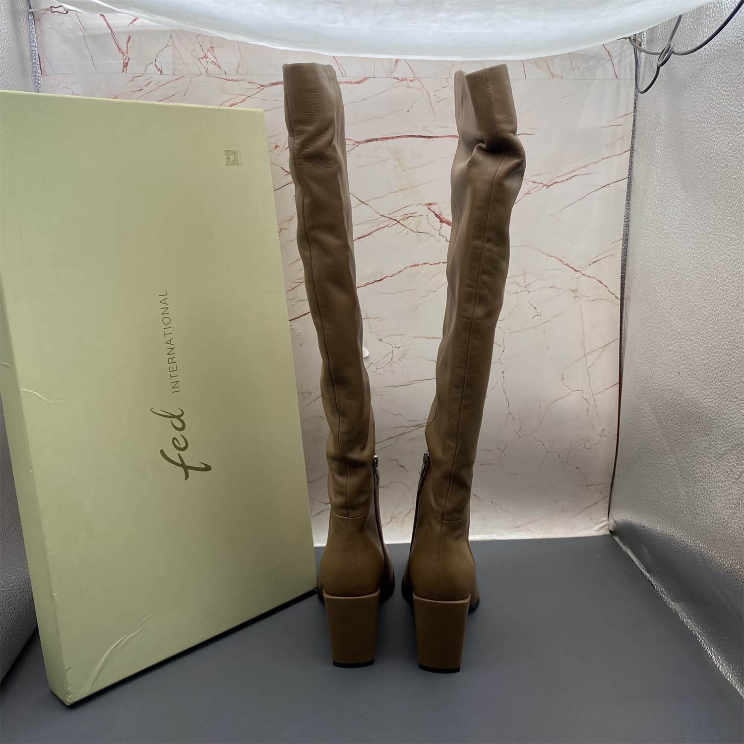 39码fed/艾芙伊迪撤柜断码羊皮女鞋圆头高跟粗跟侧拉链过膝长靴