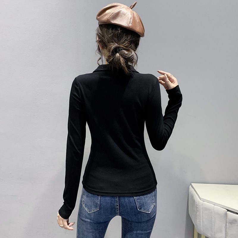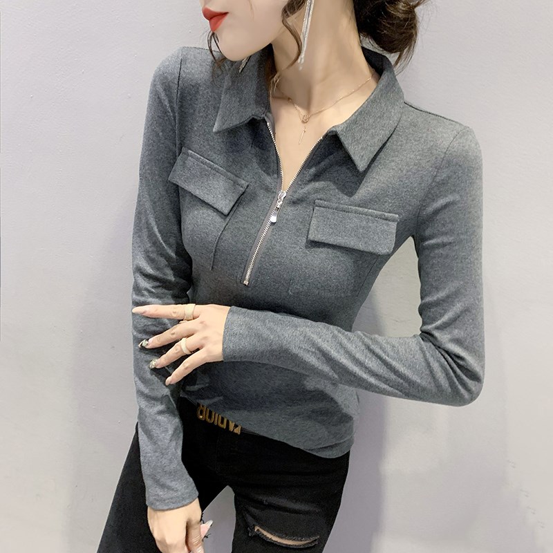 时尚拉链POLO领T恤长袖设计感气质上衣洋气修身加绒打底衫女秋冬