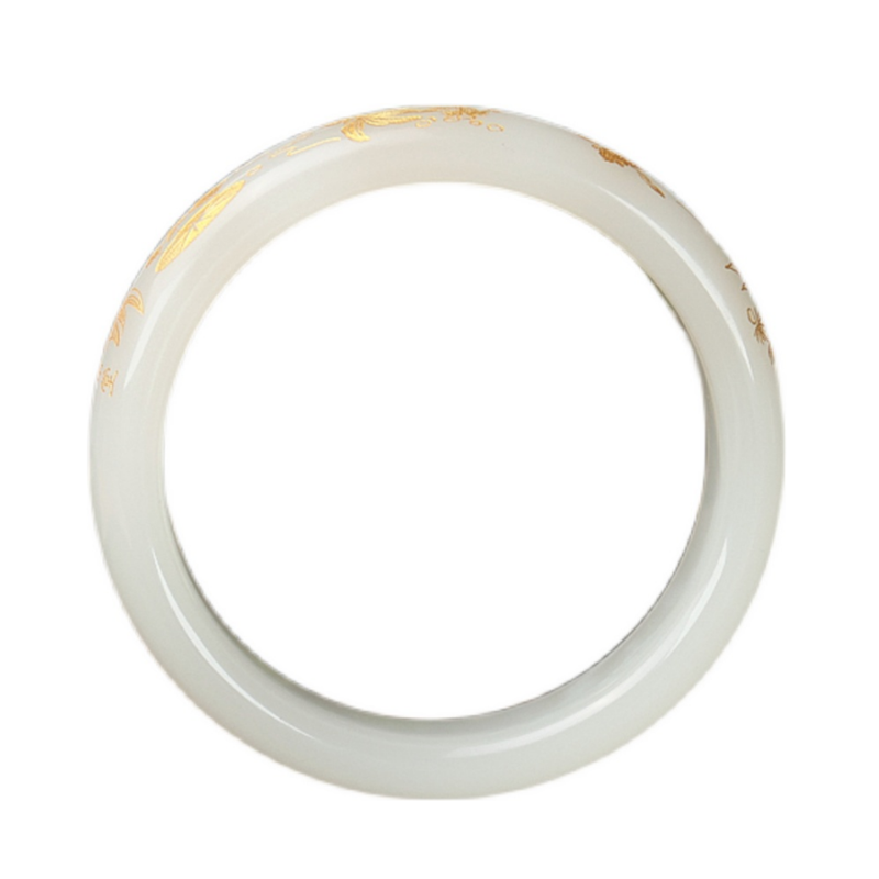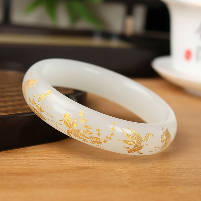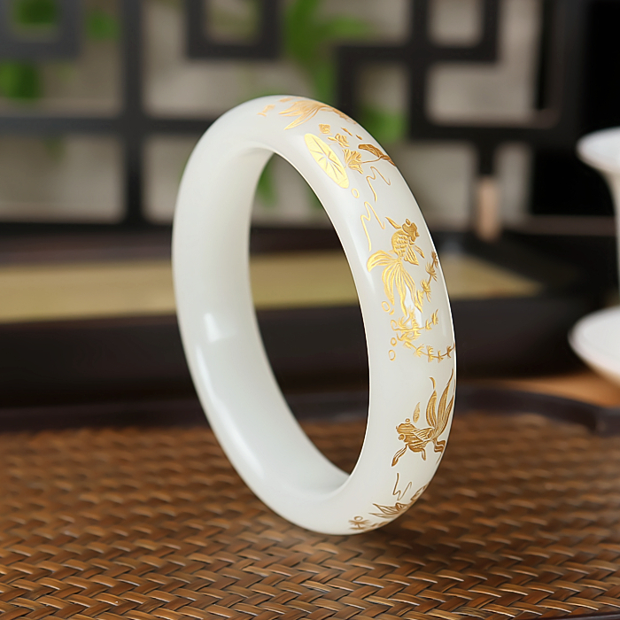 新疆和田玉手镯女款时尚羊脂玉平安镯莲花鱼金玉满堂镶嵌镯子