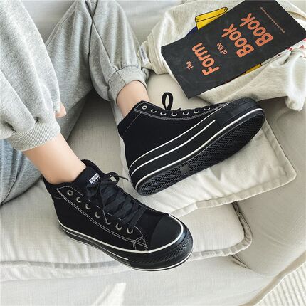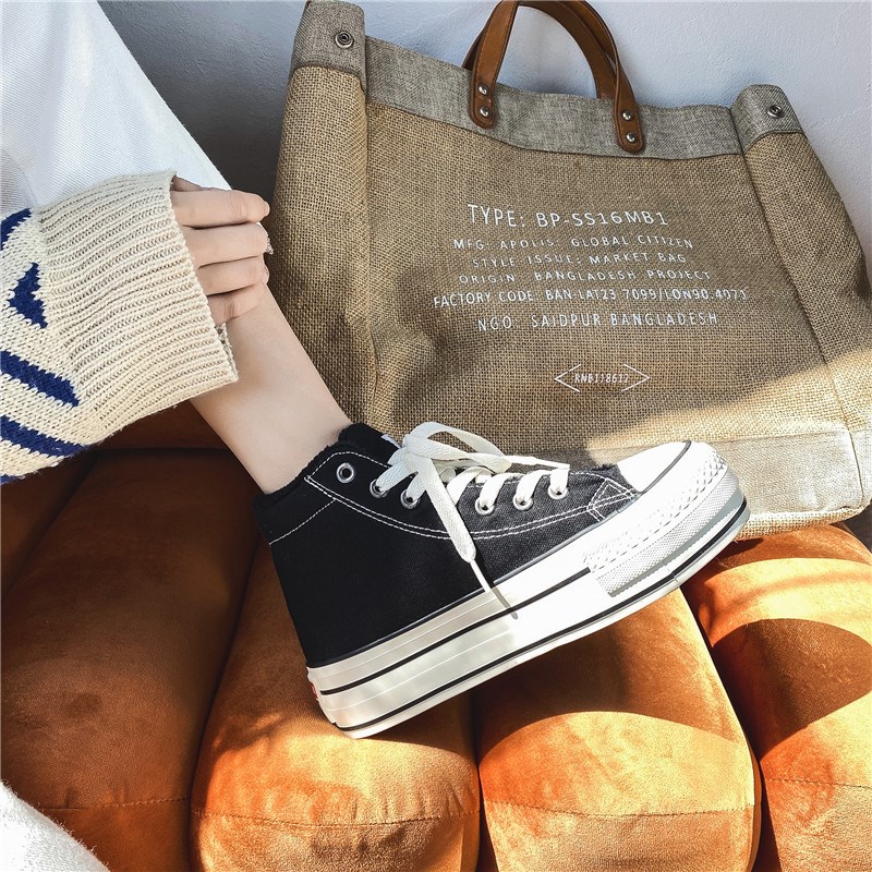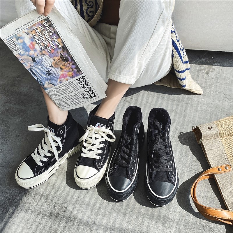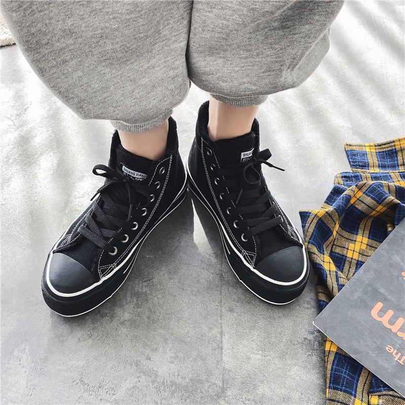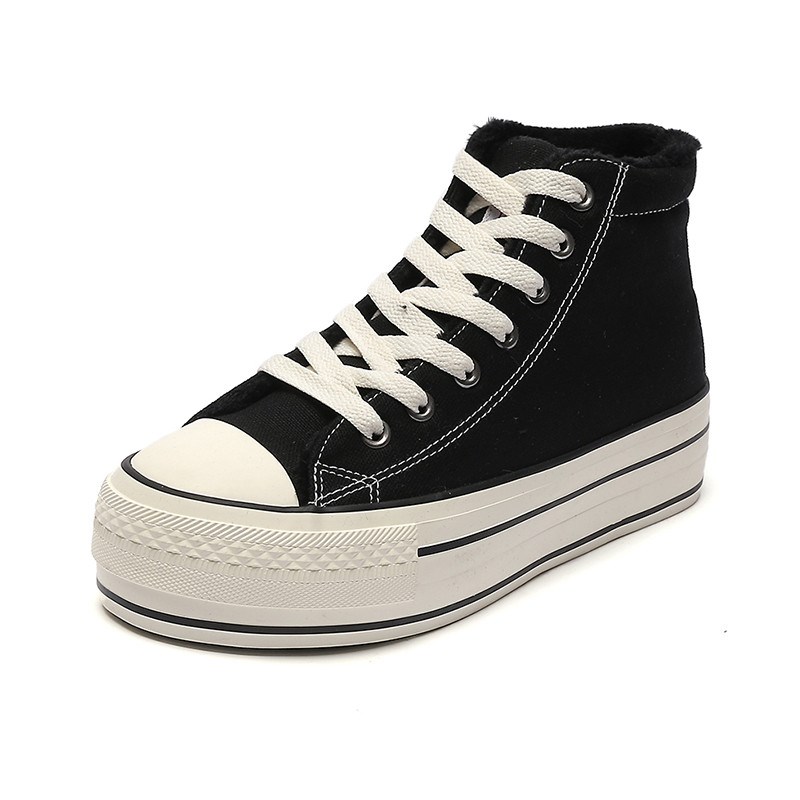 2022冬季新款厚底加绒帆布鞋女全D黑色保暖棉鞋松糕跟增高休闲鞋