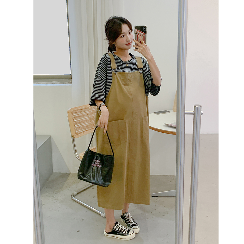 孕妇休闲工装背带裙条纹T恤夏装吊带连衣裙宽松减龄夏款潮妈裙子