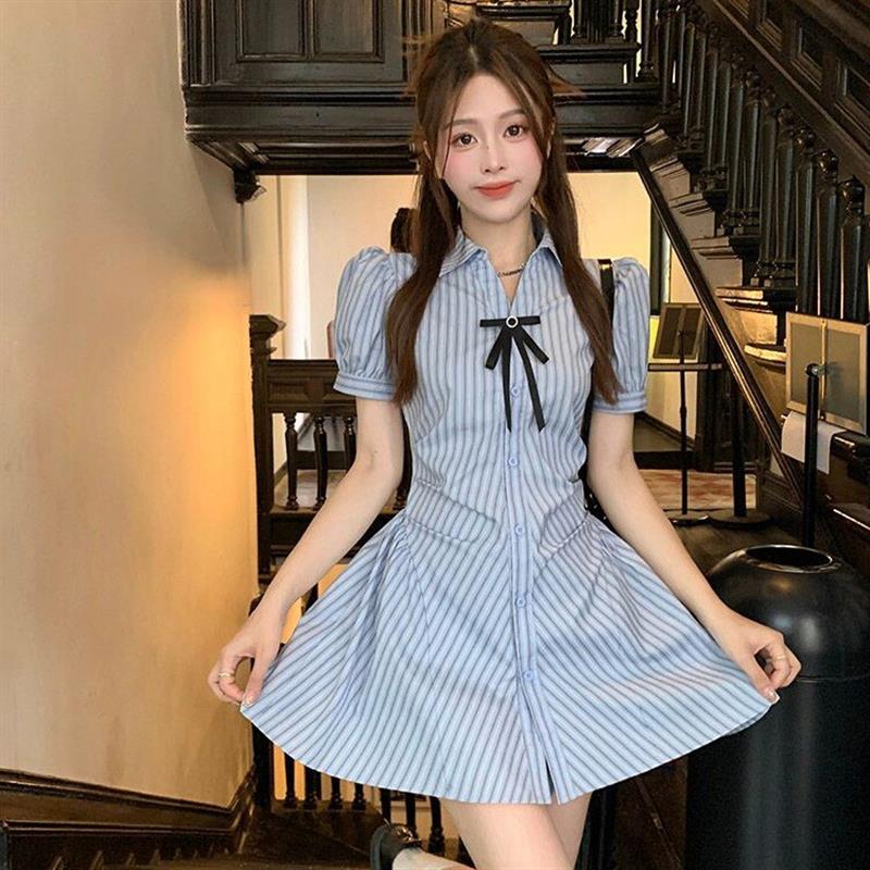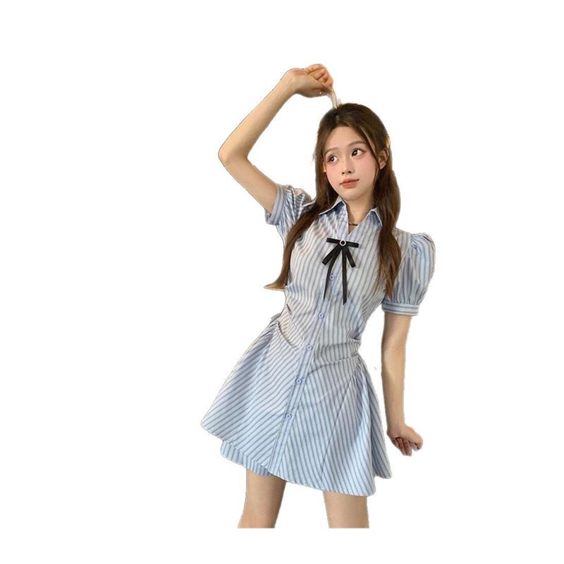 学院风套装收腰显瘦裙子条纹衬衫连衣裙女夏季高腰短裤时尚两件套