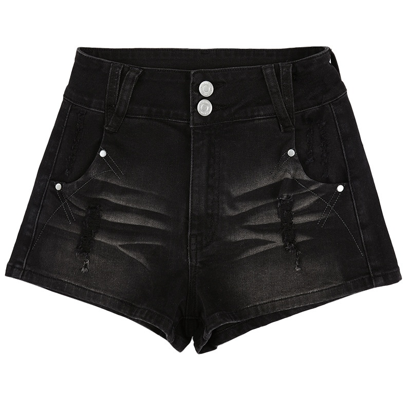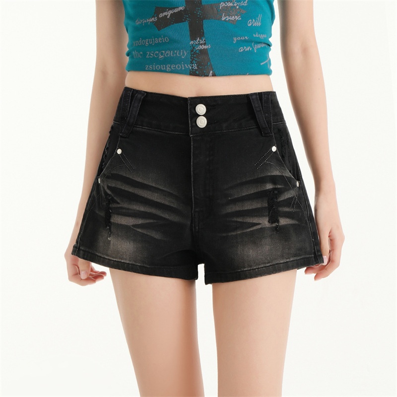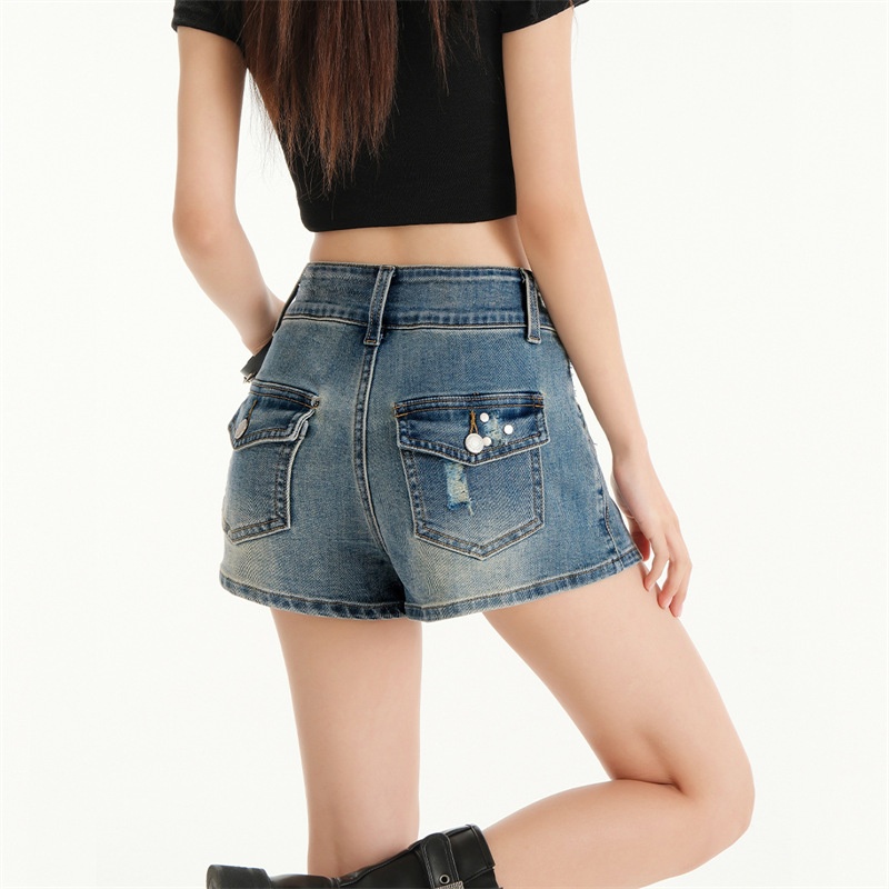 复古双扣绣花猫须破洞时尚设计2025夏季新款显瘦牛仔短裤女薄