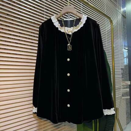 珍珠饰休闲小衫韩范胖妹妹赫本风加大码丝绒上衣宽松气质打底衬衫