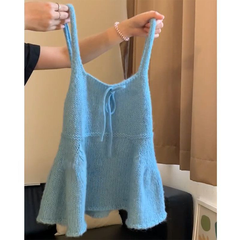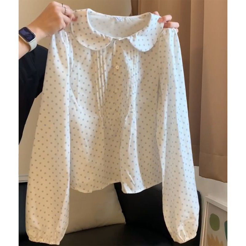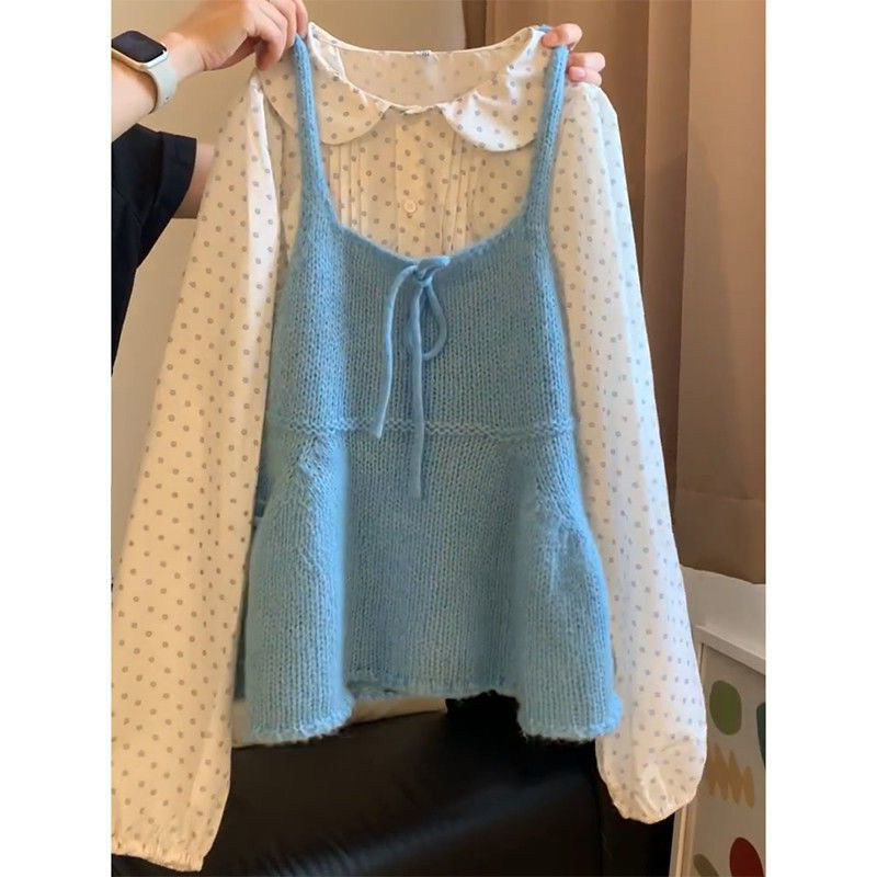 春秋甜美少女减龄气质娃娃领波点衬衫+蓝色针织吊带背心两件套装