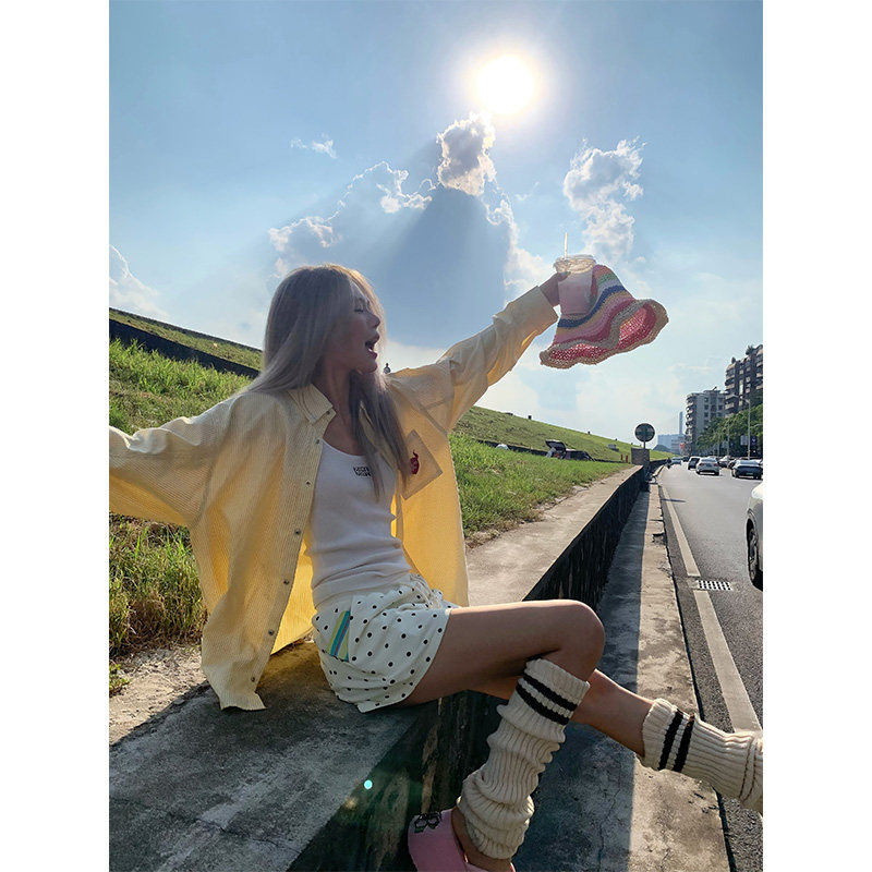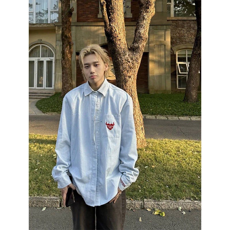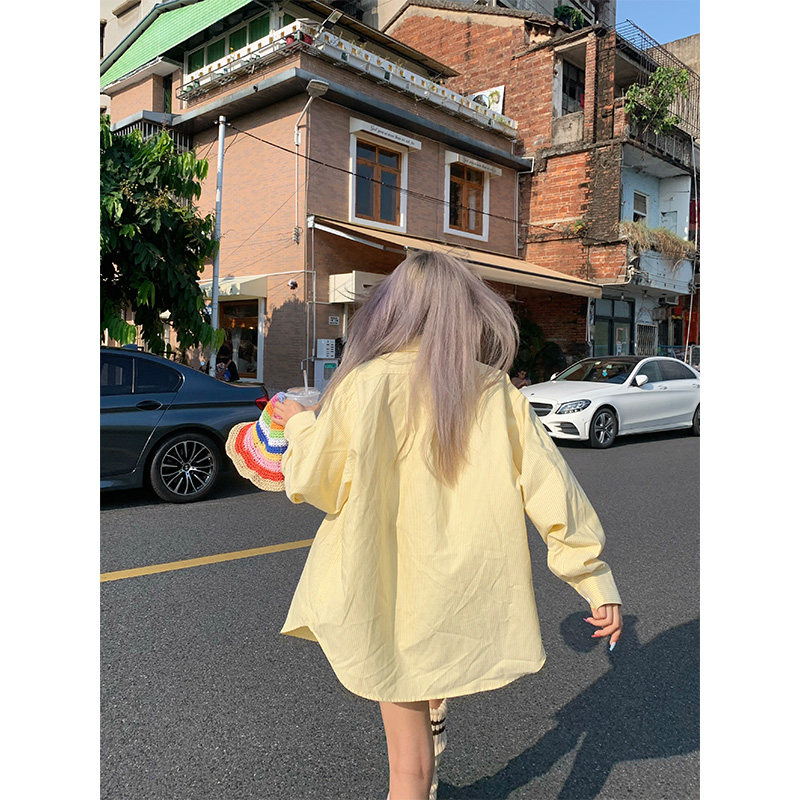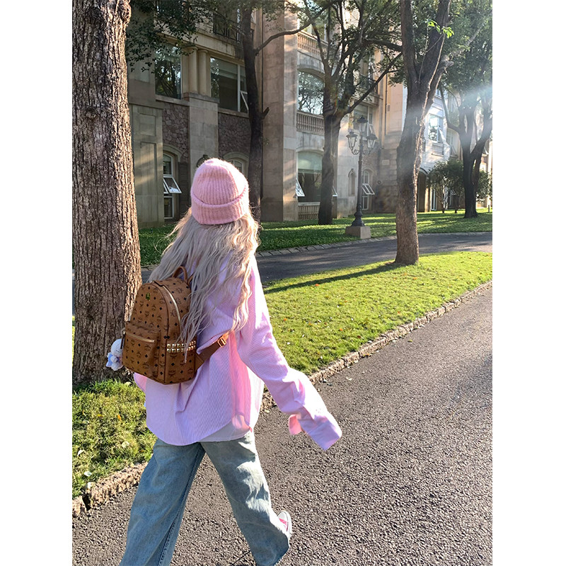 NECOYEP原创 美式气质条纹粉色宽松衬衣外套情侣春秋款长袖衬衫女