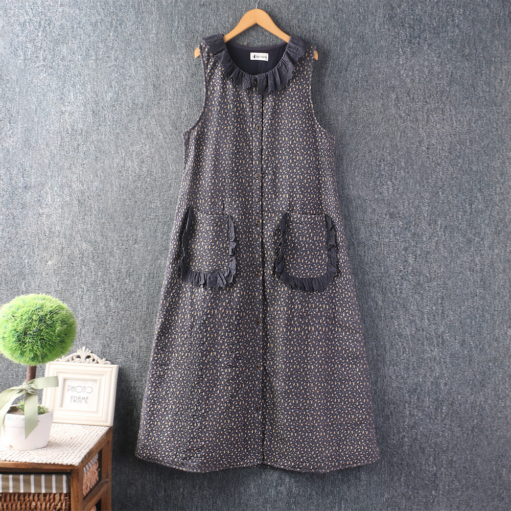 秋冬新款女装文艺甜美钩花翻领棉麻夹棉马甲裙宽松叠穿背心连衣裙