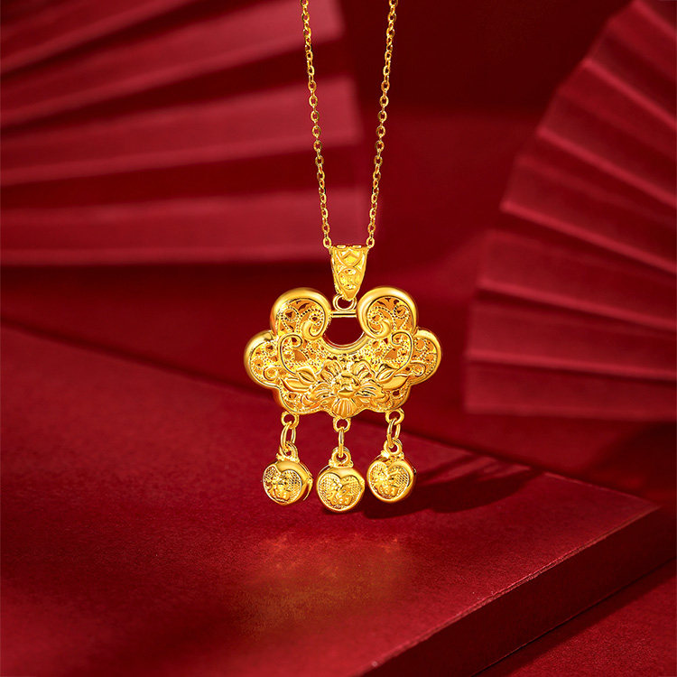 梦金园显大牡丹平安锁吊坠足银福字百福长命锁挂坠送女生日礼物