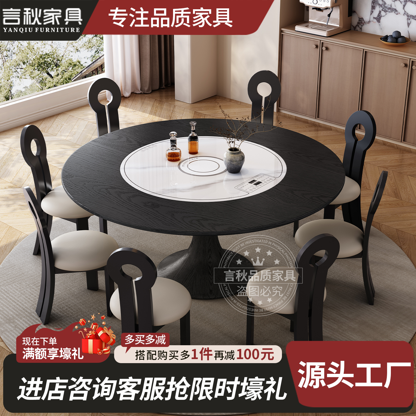 法式复古实木圆餐桌椅内嵌电磁炉暖菜电动转盘家用白蜡木圆形饭桌