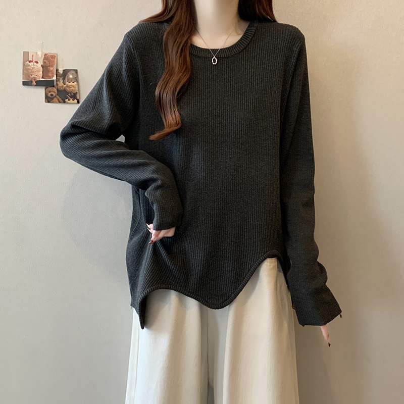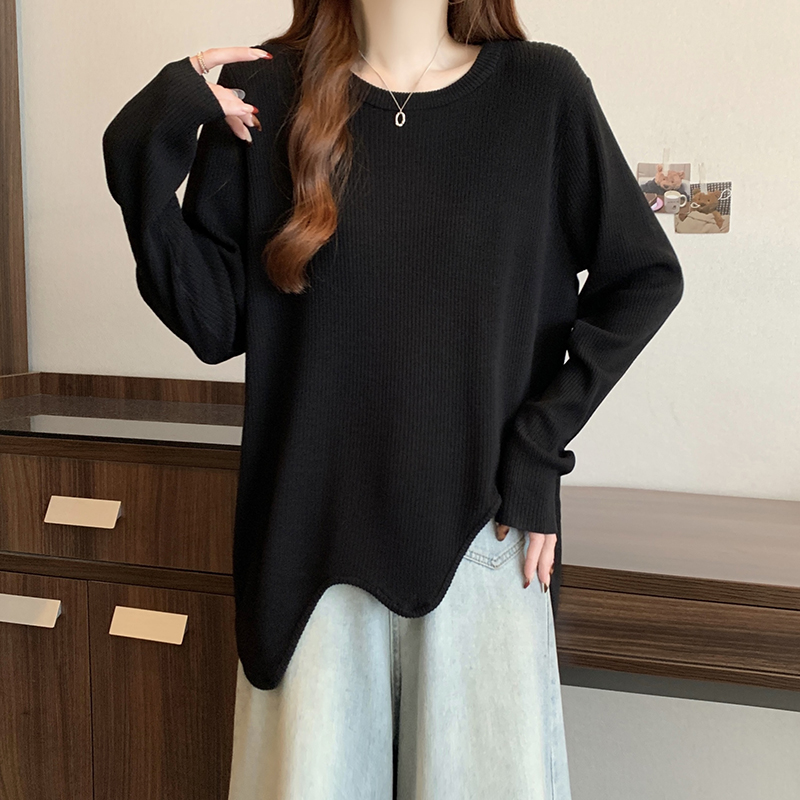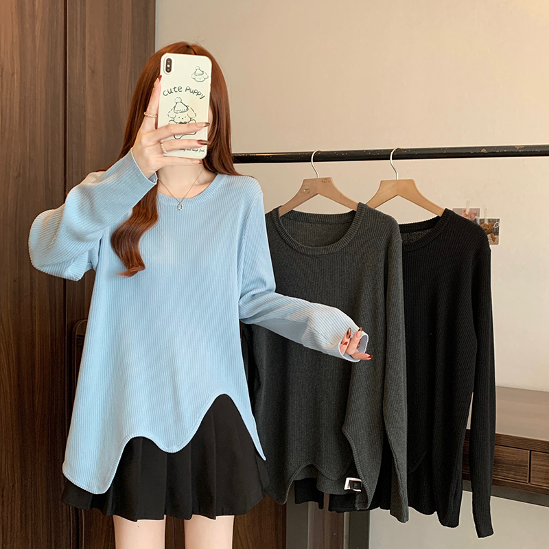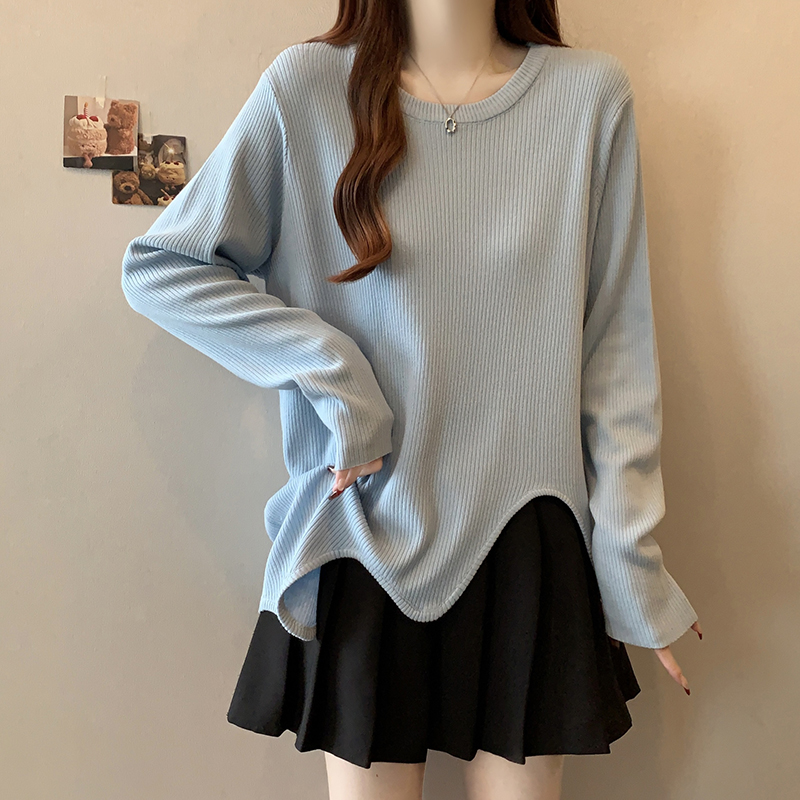 大码蓝色正肩长袖t恤女秋季2025新款胖mm显瘦宽松中长款针织上衣