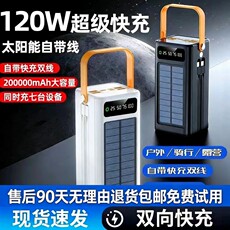 超大容量户外太阳能自带苹果线120w快充双线全手机通用充电宝户外
