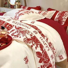法式浪漫玫瑰提花婚庆四件套60支长绒棉印花红色结婚裙摆被套床单