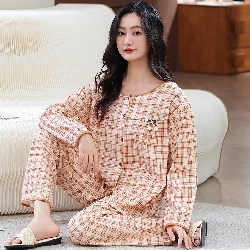 睡衣女春秋季纯棉薄款可外穿格子2025新款中年老年套装家居服秋冬