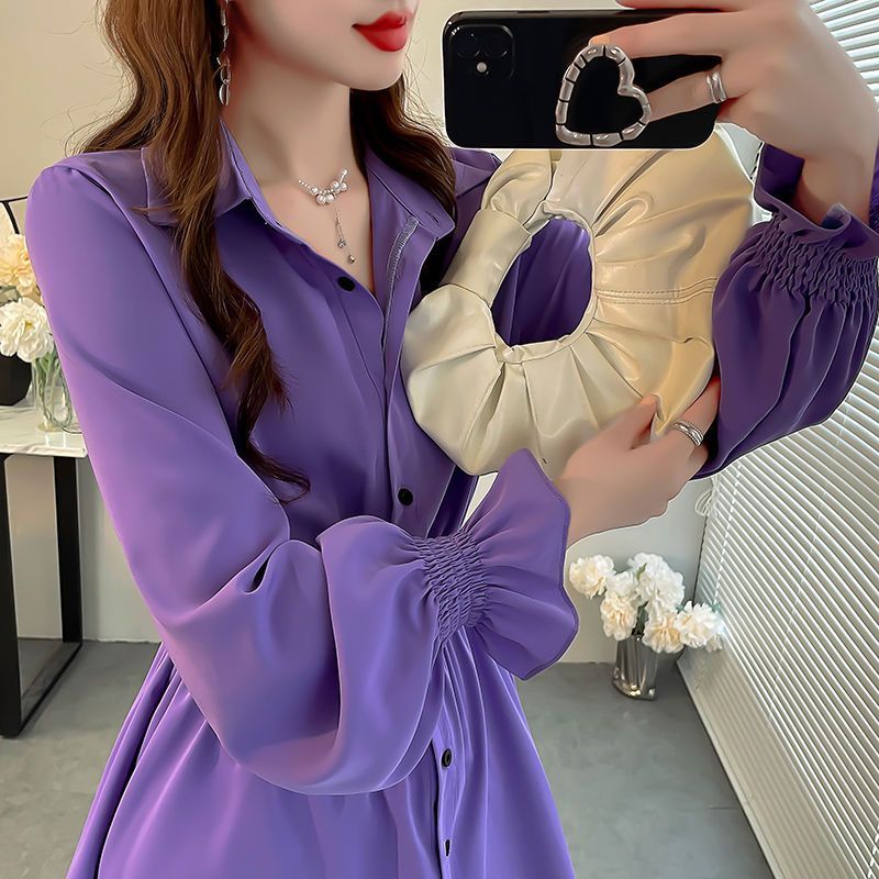 韩版秋上衣女2025新款喇叭袖衬衫显瘦收腰设计中长款纯色雪纺衬衣