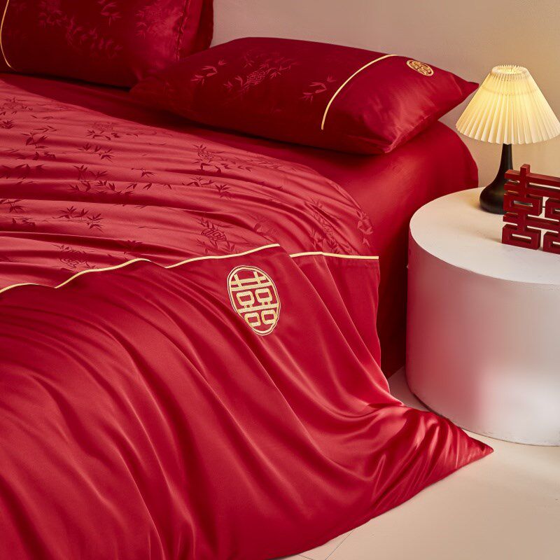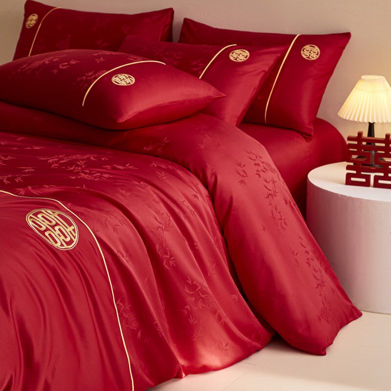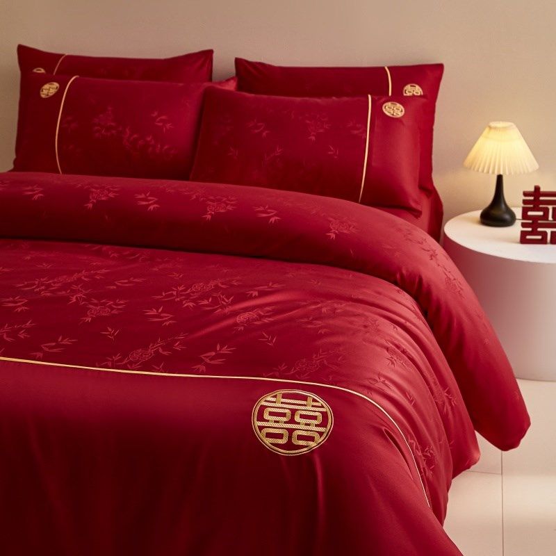 中式喜字结婚四件套大红t色陪嫁床单被套婚庆床上用品婚房喜被