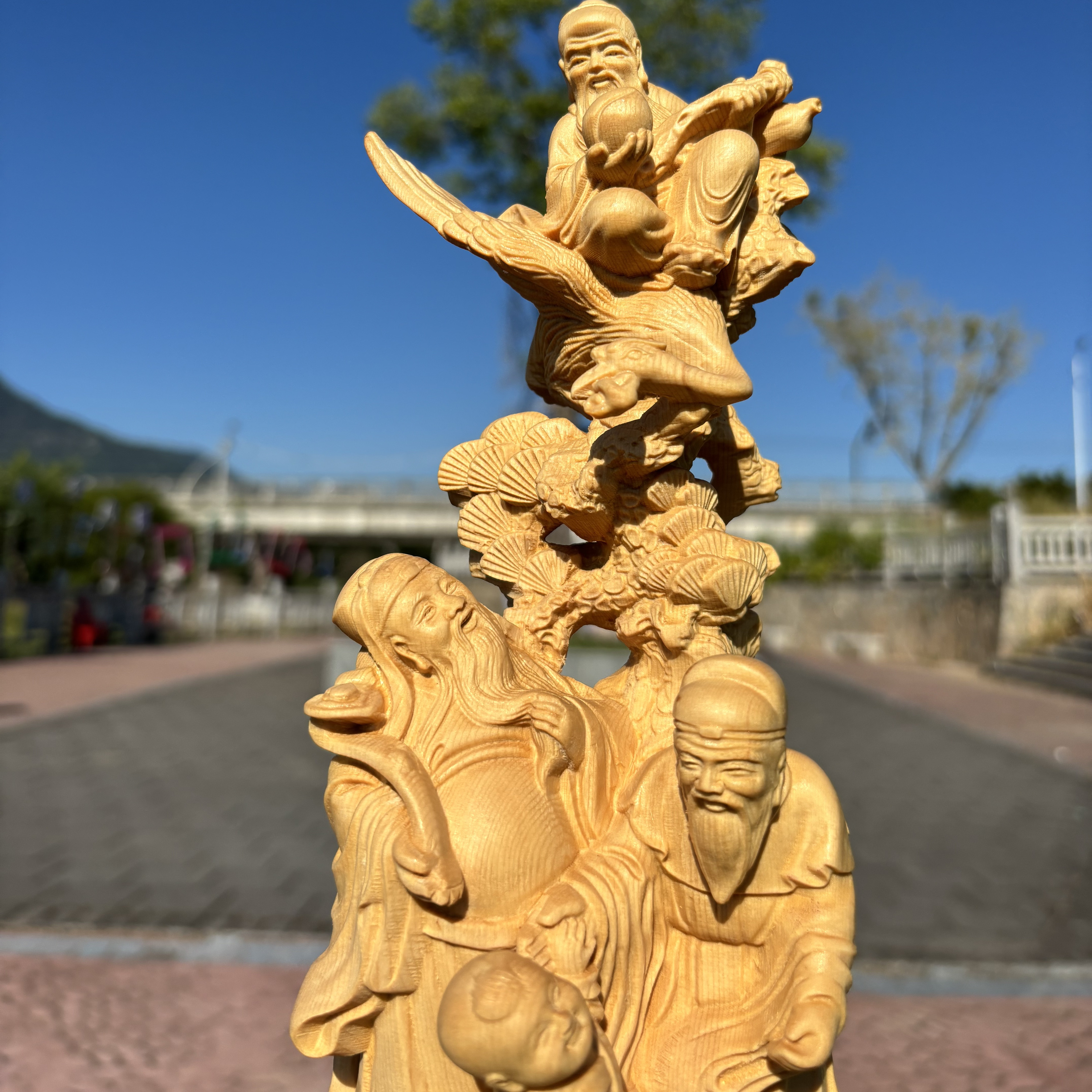 桧木精雕福禄寿三星摆件实木雕刻居家客厅装饰工艺
