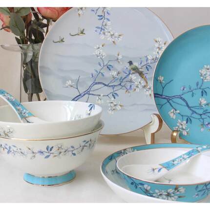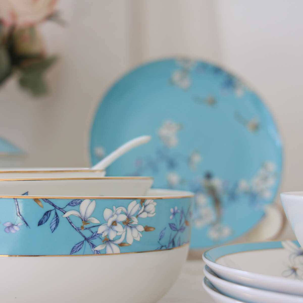 新中式中国风青花碗碟套装瓷器家用高档轻奢水云间骨瓷餐具