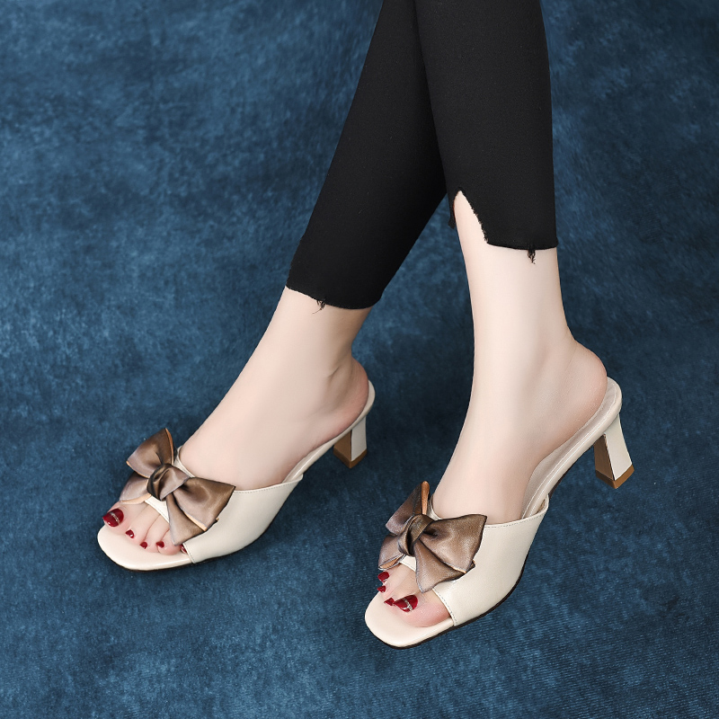 2025年新款气质高跟凉拖鞋女外穿夏季软皮中跟细跟蝴蝶结真皮拖鞋