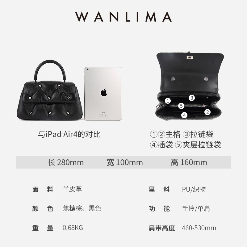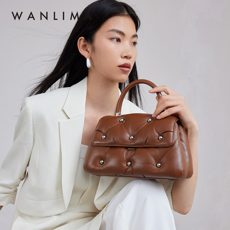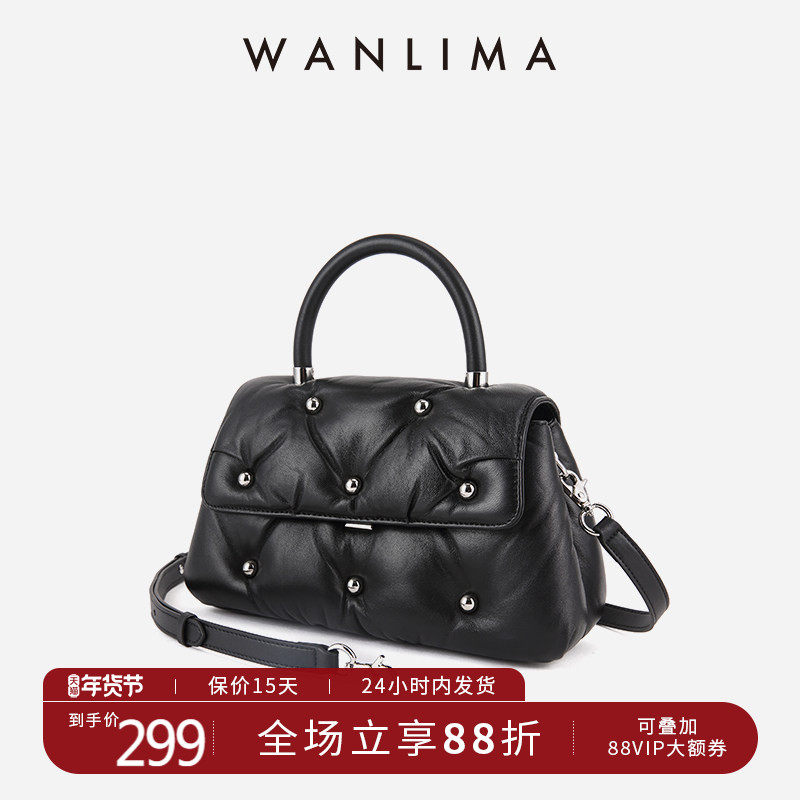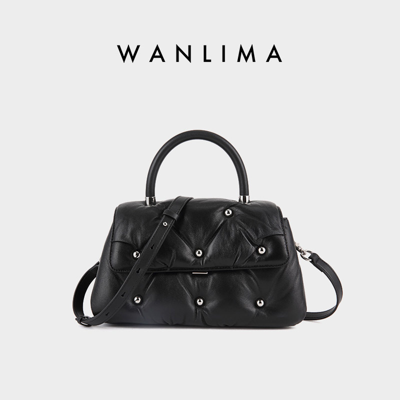 万里马新款铆钉软羊皮羽绒包绗缝菱格女包手提单肩斜跨质感小方包