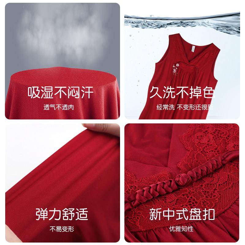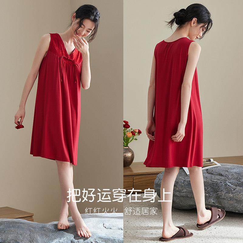 轩靓新中式睡裙女士夏季莫代尔背心红色睡衣冰丝凉感家居服连衣裙