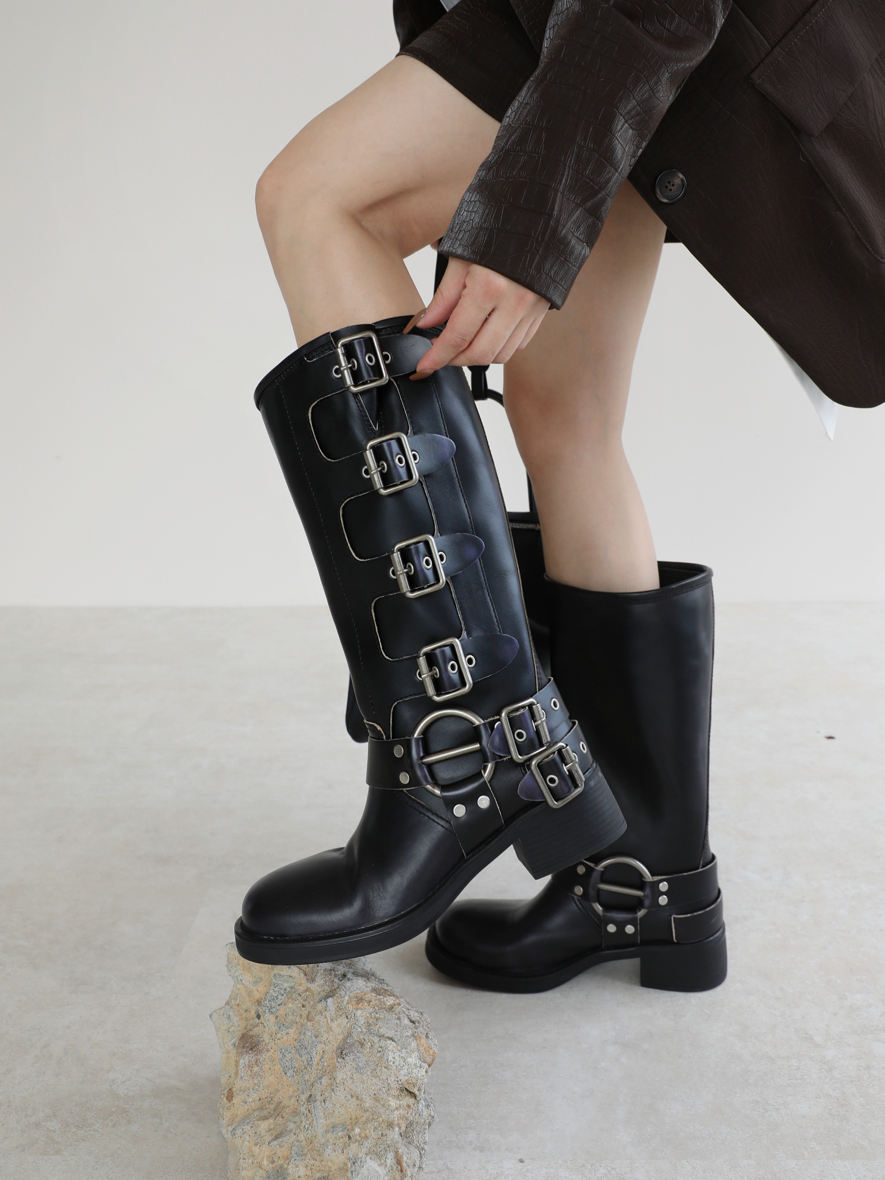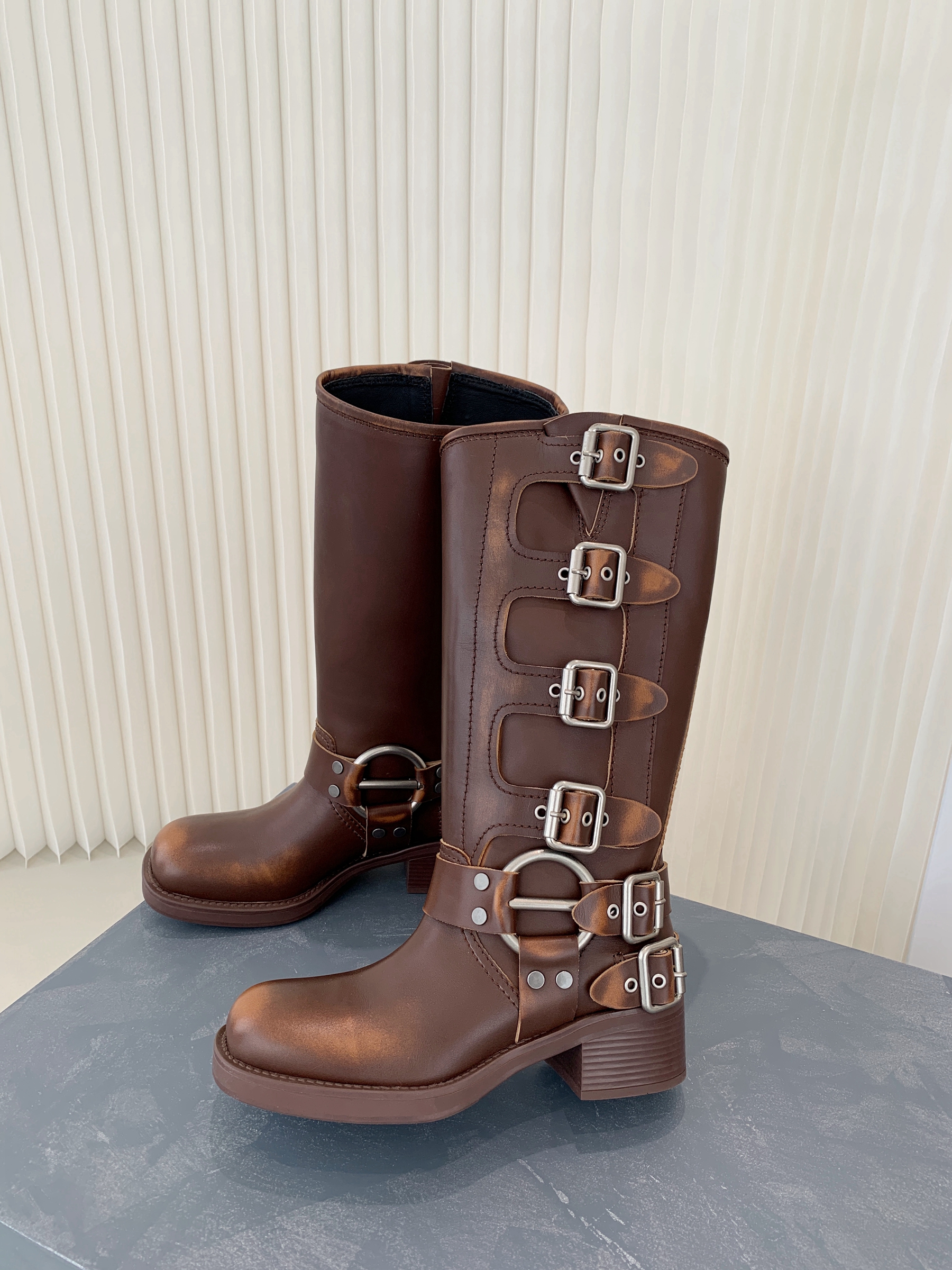InkingPot彭姐 皮带扣长筒骑士靴女粗跟复古擦色牛皮西部牛仔靴子