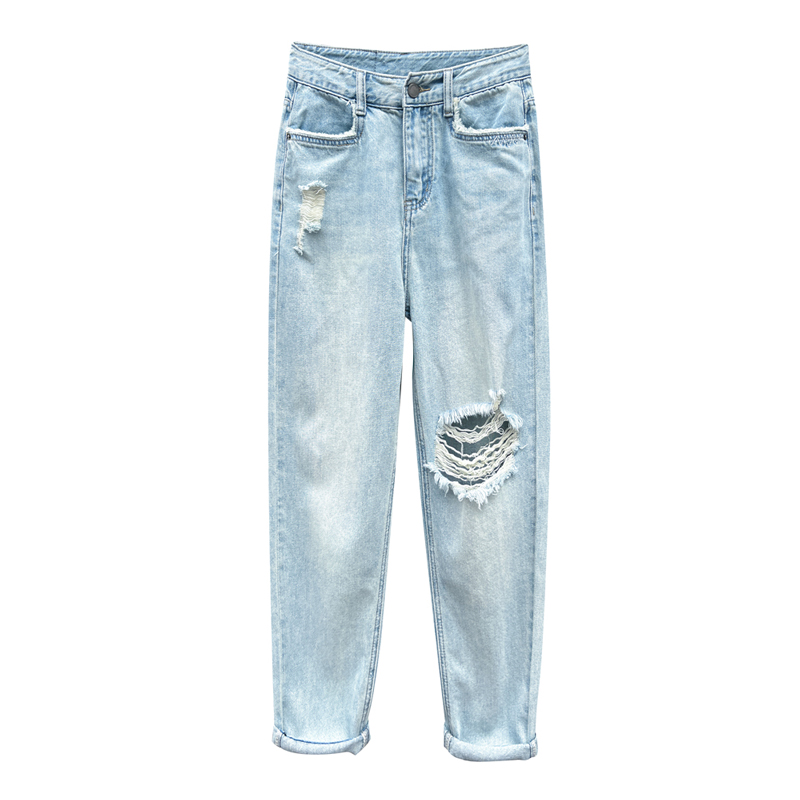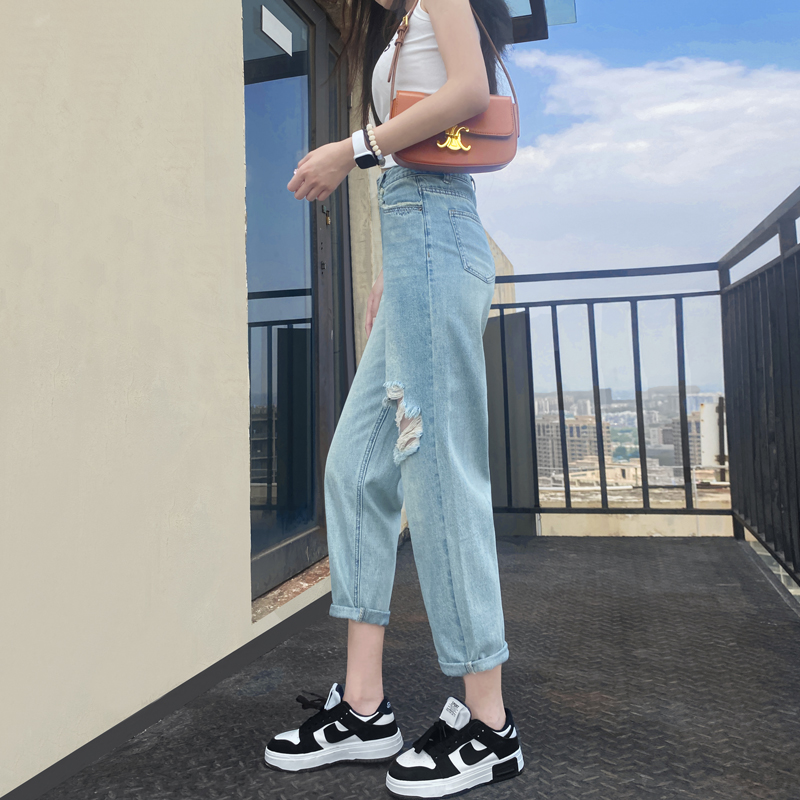 小众设计浅色薄款牛仔裤女夏前后破洞高腰宽松九分直筒哈伦老爹裤