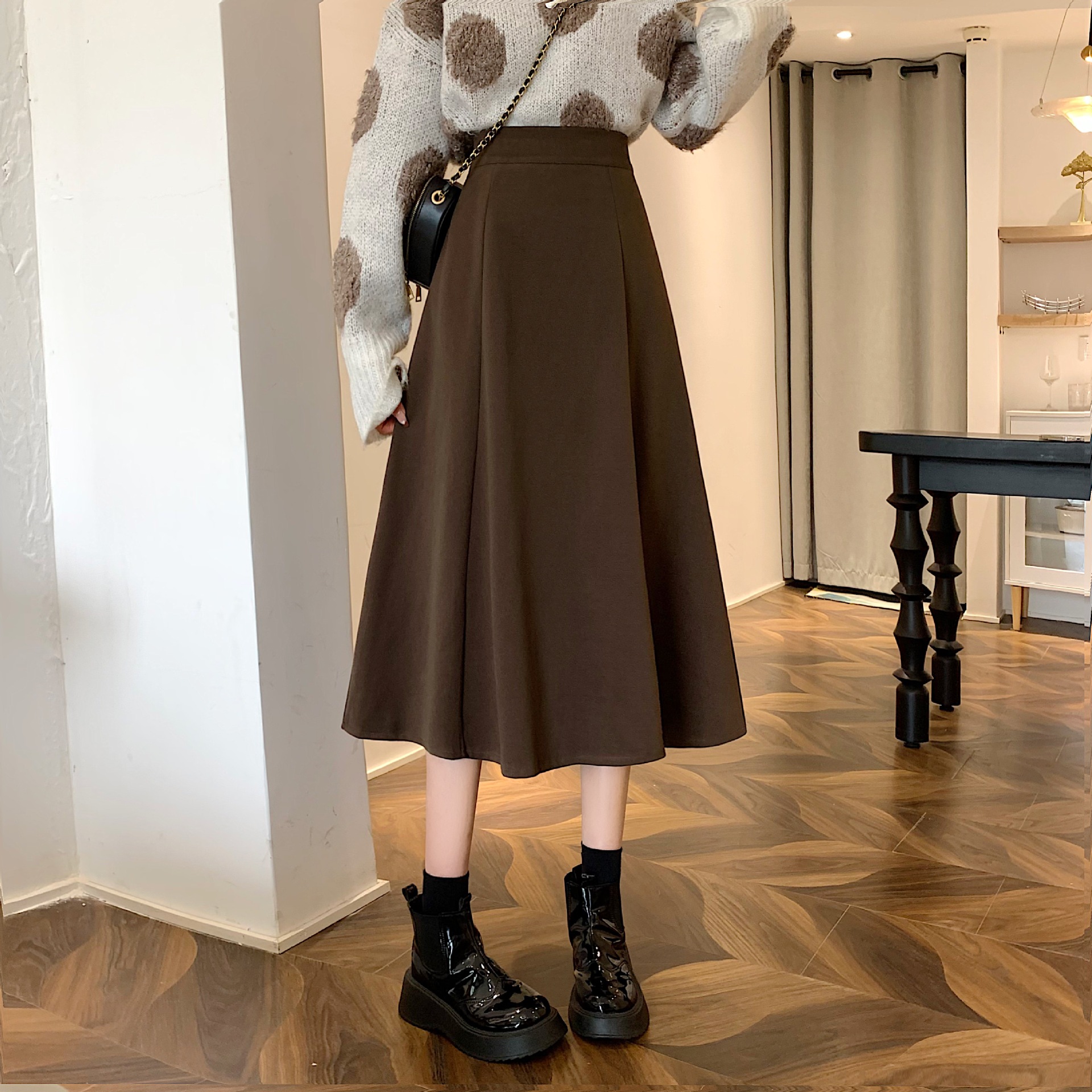 2025新款春秋气质咖色半身裙女秋冬加厚中长款高腰百褶a字伞裙小