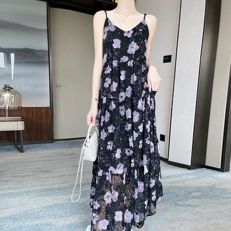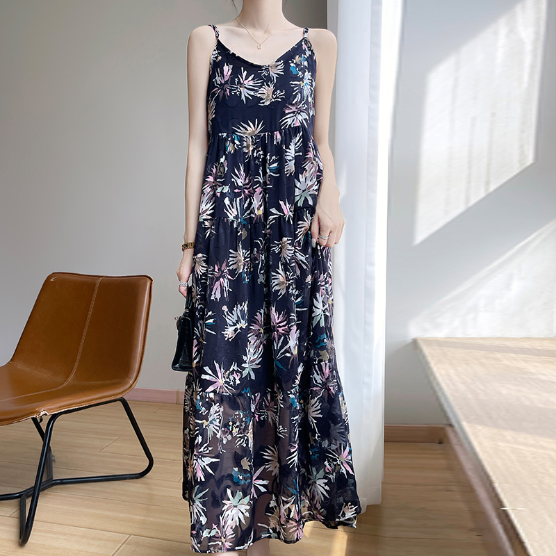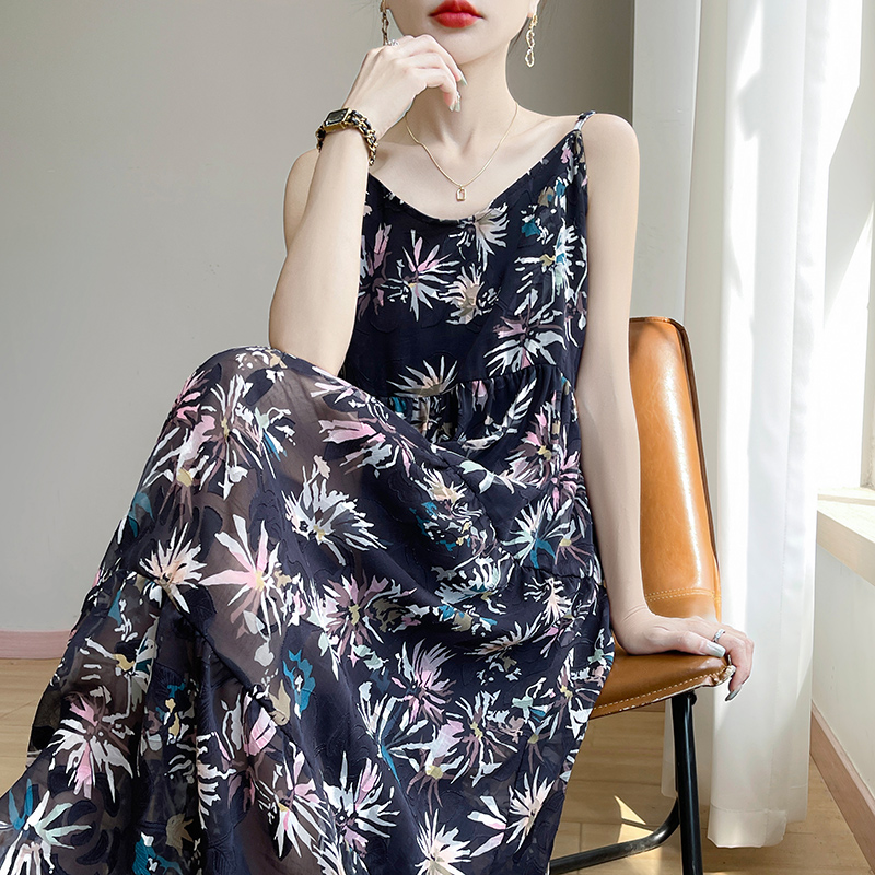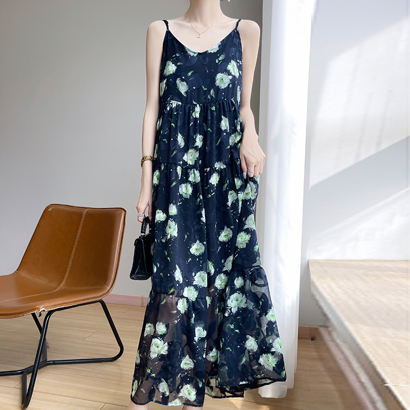 25夏季千云纱吊带连衣裙女V领印花长裙宽松气质过膝A字裙背心长裙