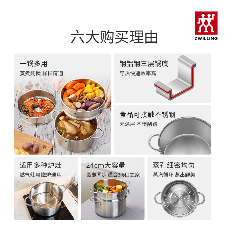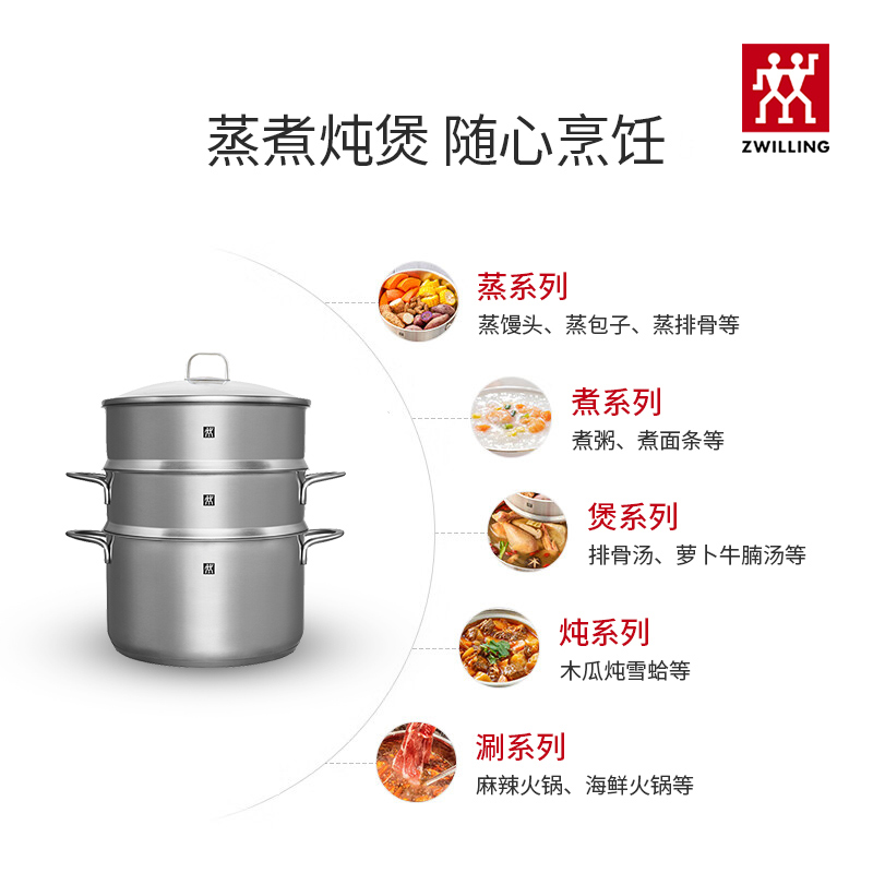 双立人NovaPlus蒸锅不锈钢炖锅无涂层家用304蒸笼煤气电磁炉汤锅