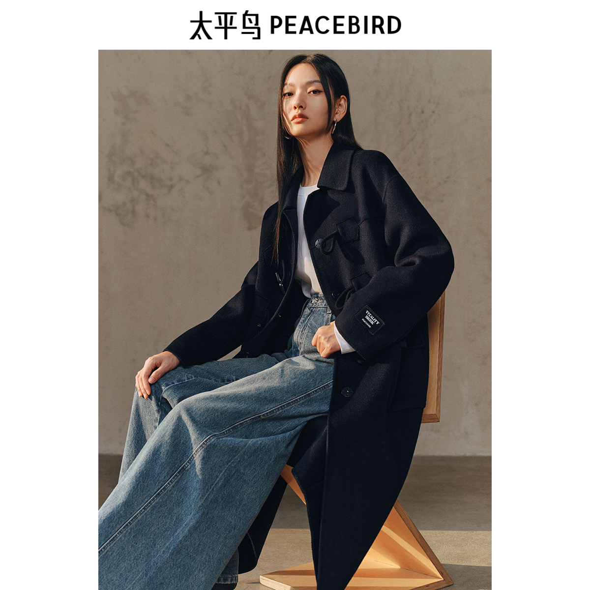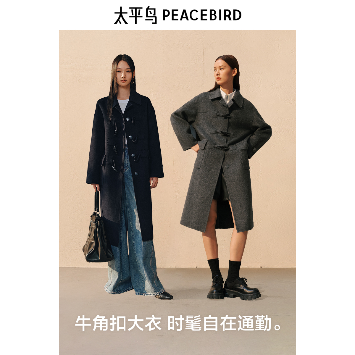 太平鸟大师甄毛系列全羊毛灰色牛角扣双面呢大衣女冬新款长款外套