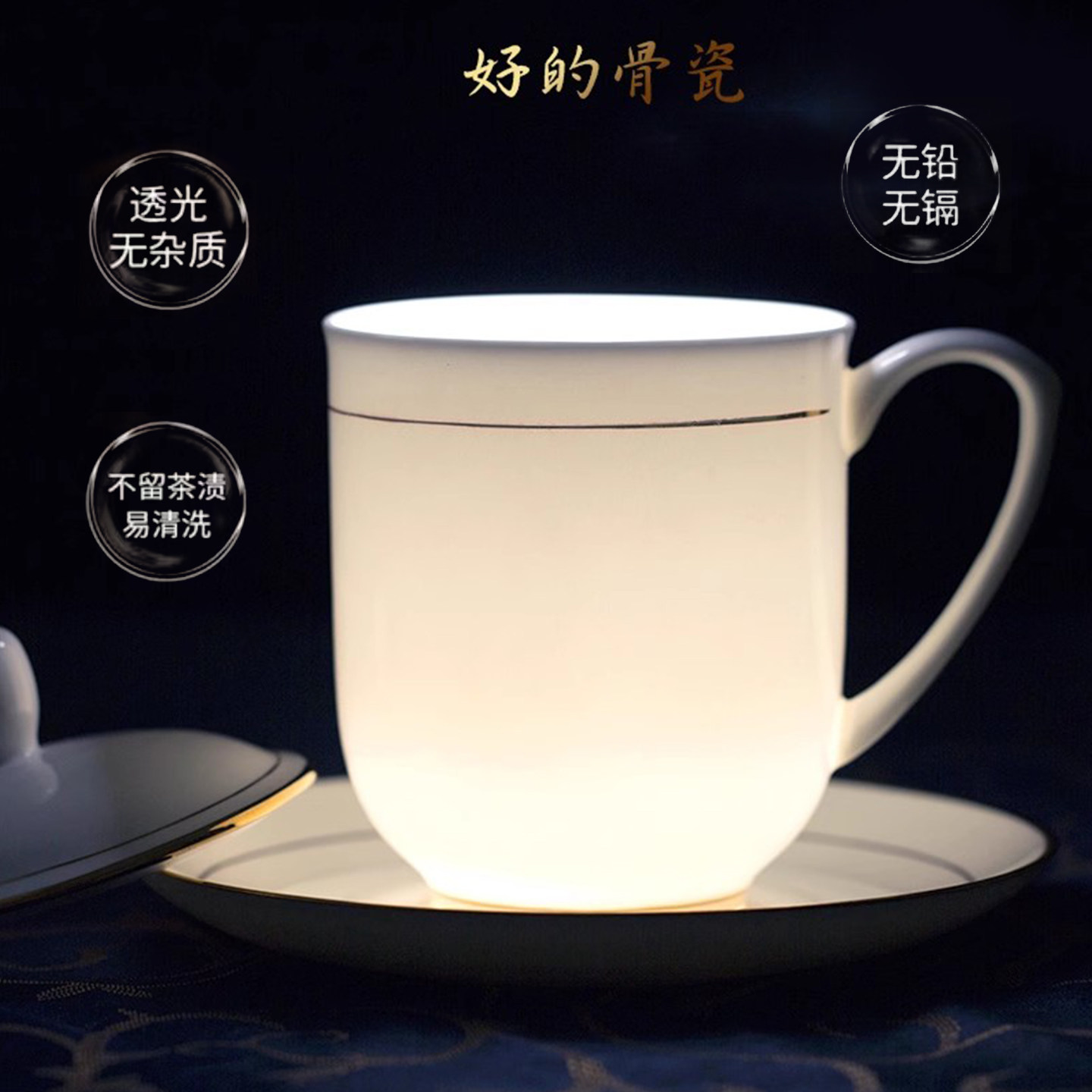 景德镇骨瓷茶杯套装带盖碟办公家用陶瓷杯子会议杯定制水杯10只装