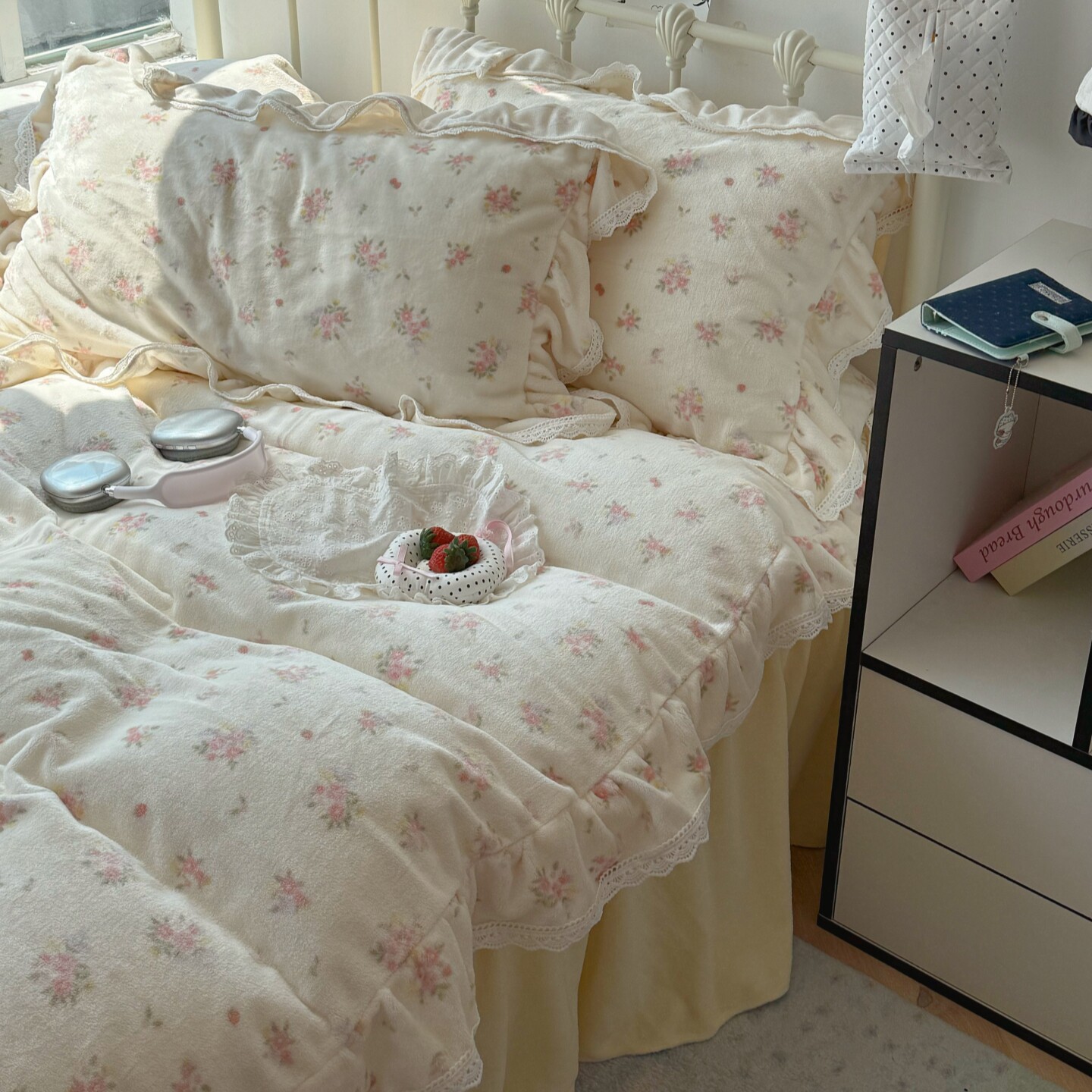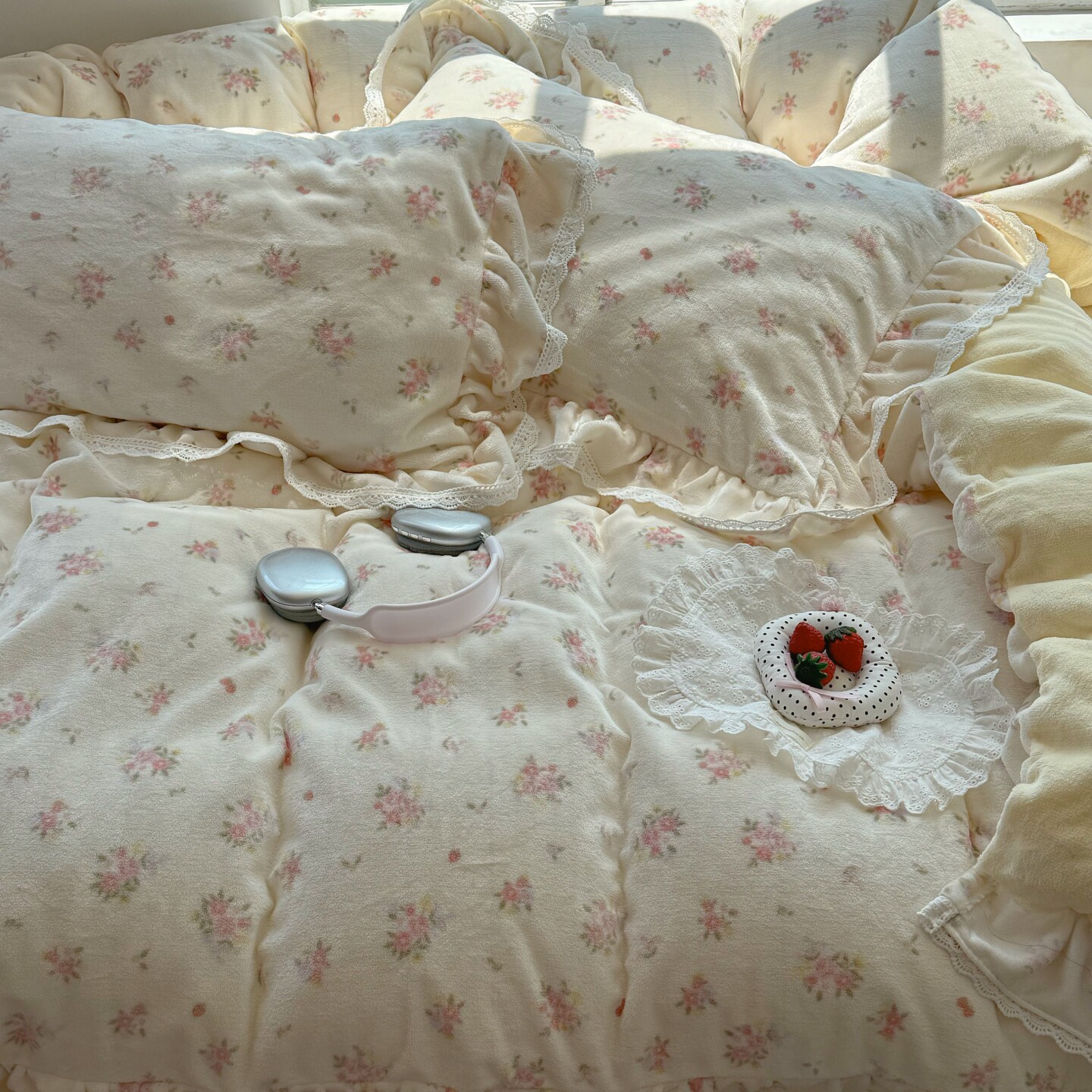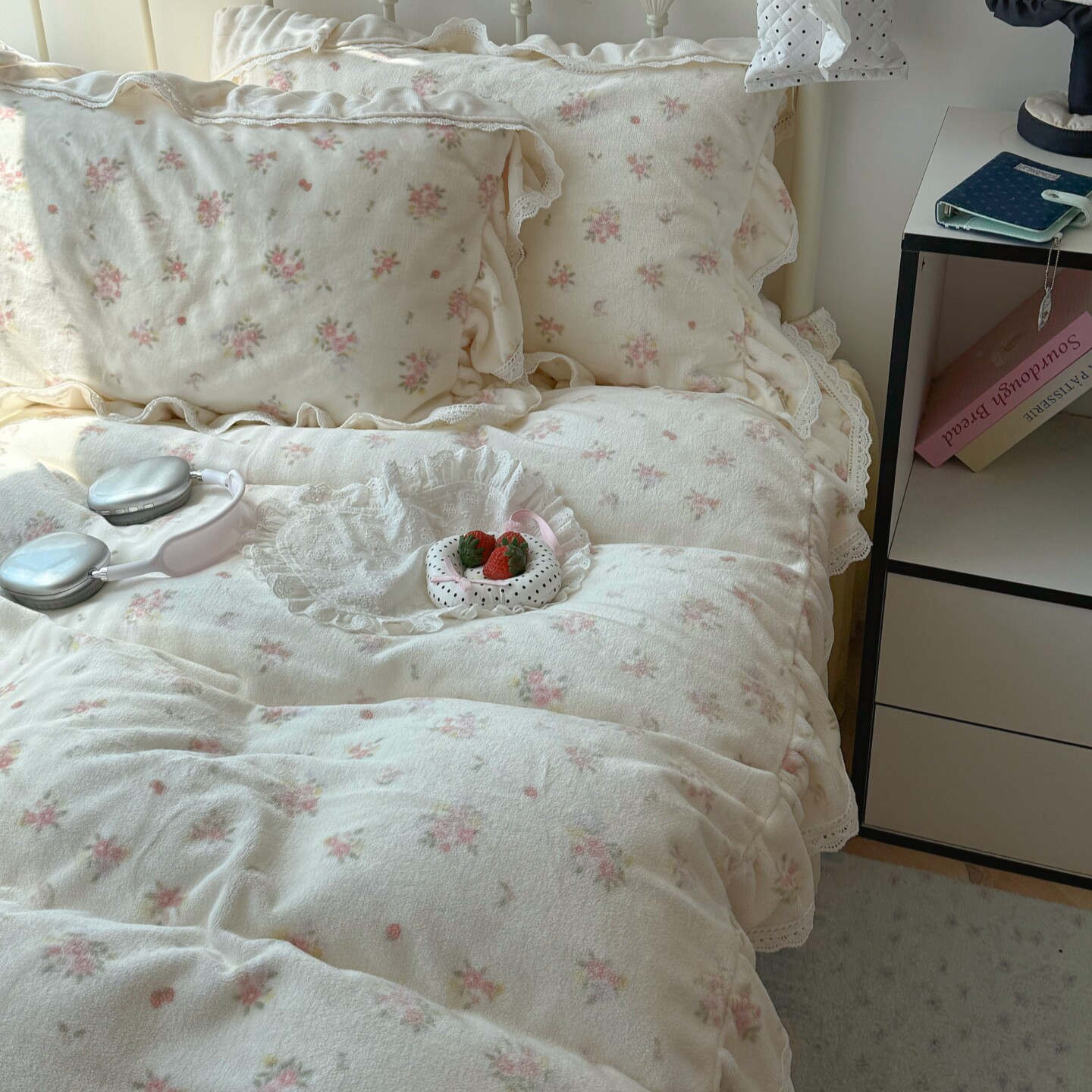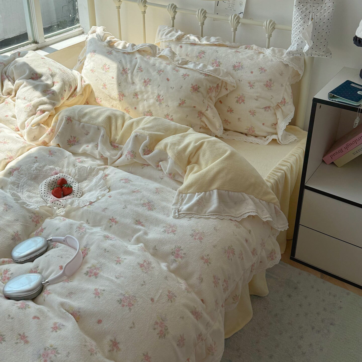梨梦 暖香春野 法式碎花牛奶绒四件套保暖珊瑚绒床单被套床上用品