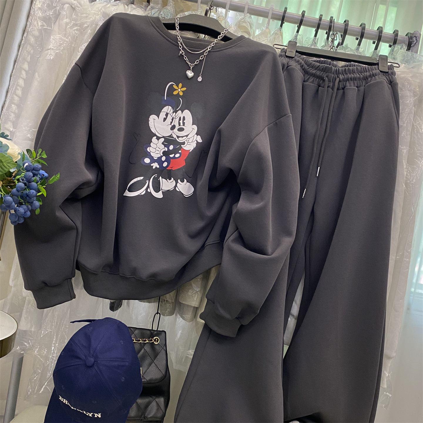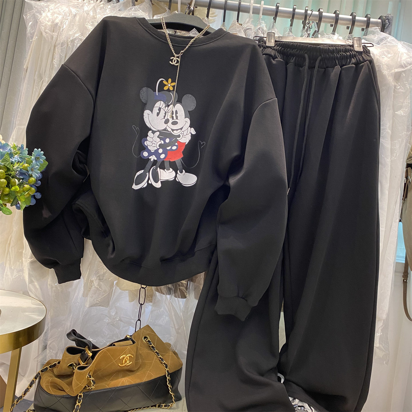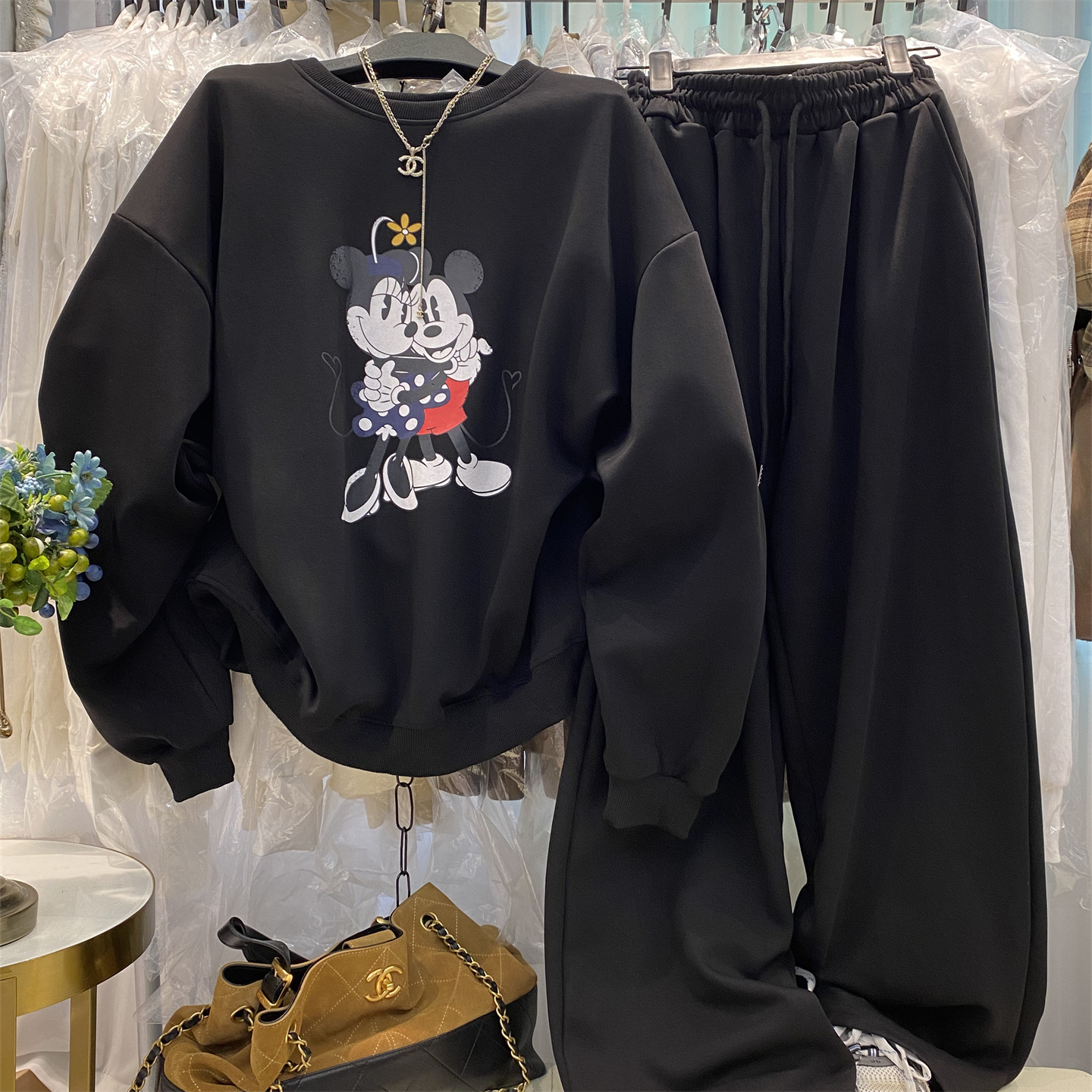 韩系慵懒穿搭一整套卡通印花圆领长袖卫衣搭高腰抽绳阔腿裤长裤子