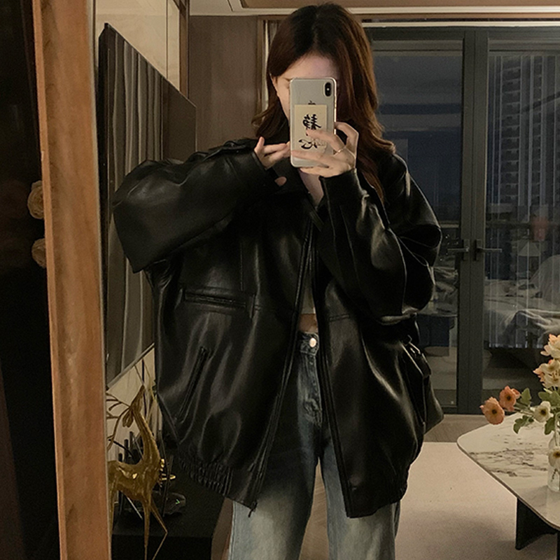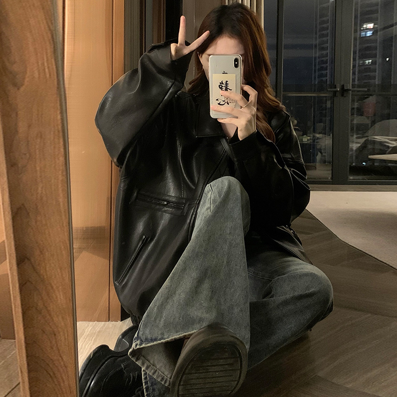 实拍 黑色美式复古廓形皮衣外套夹克女秋冬新款高级感机车服上衣