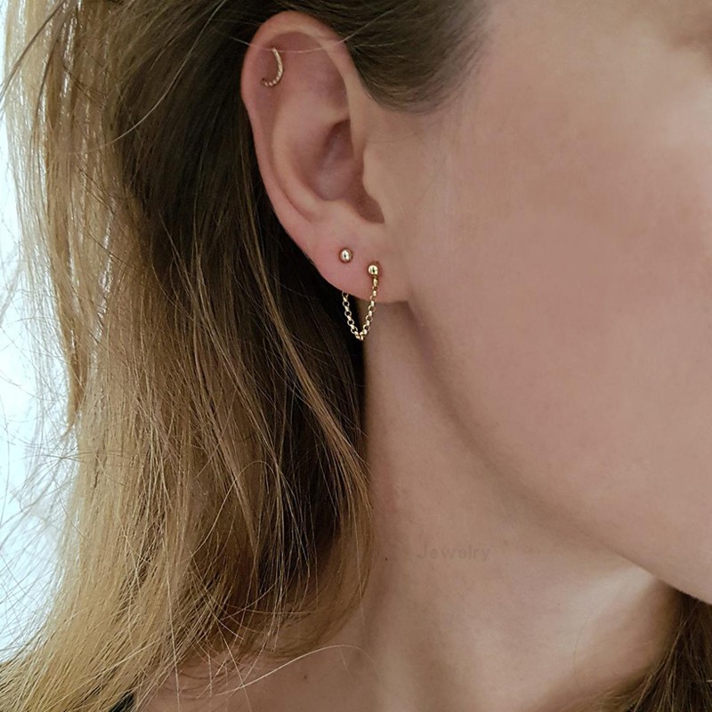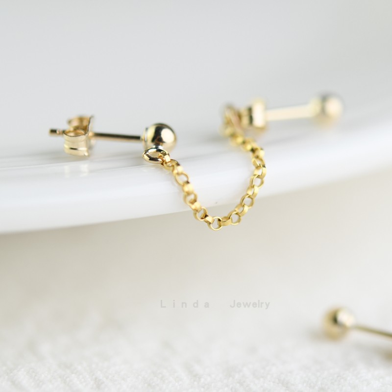 新款双耳洞耳钉女防过敏不褪色14K包金链式耳饰个性极简免摘小巧