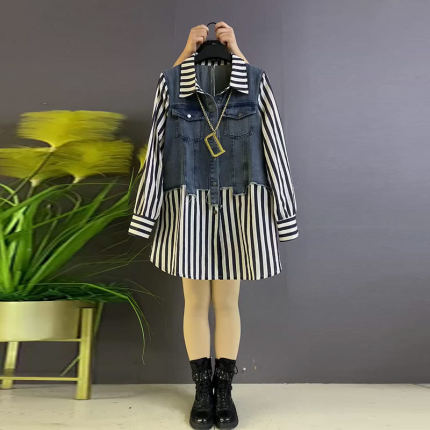 大码女装翻领拼接牛仔条纹衬衫胖MM春秋款休闲百搭长袖假两件上衣