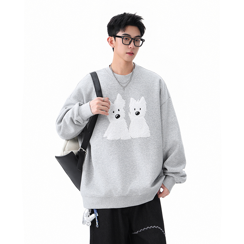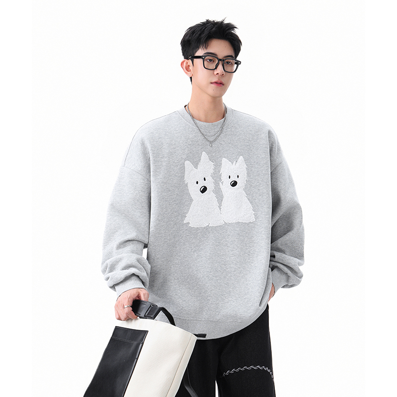 迈特优春秋季男女装针织可爱贴布绣小狗圆领卫衣落肩情侣上衣