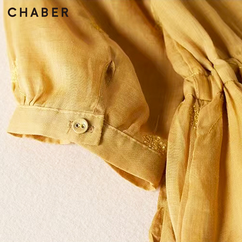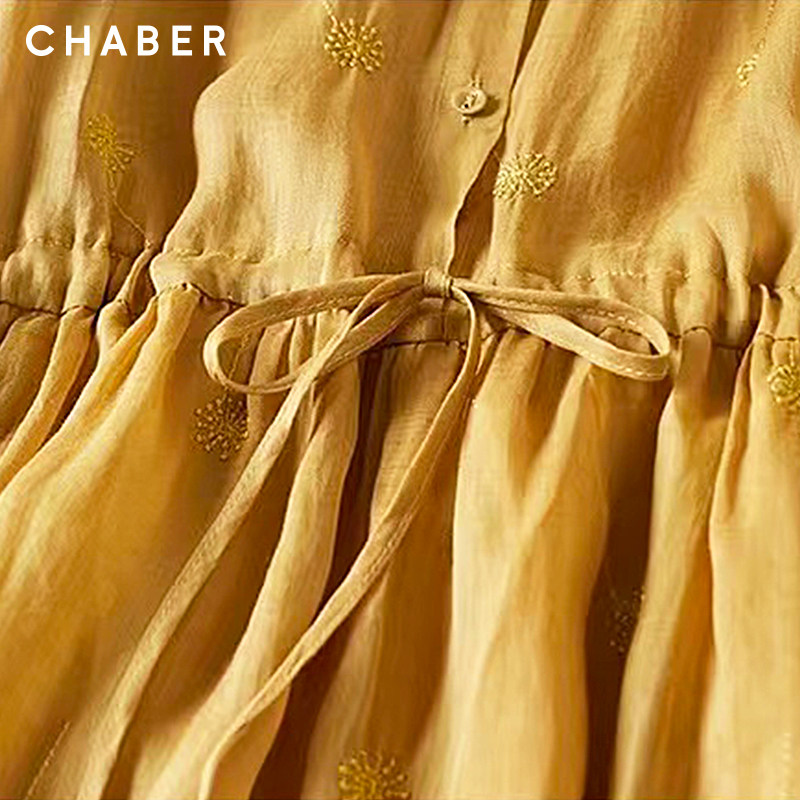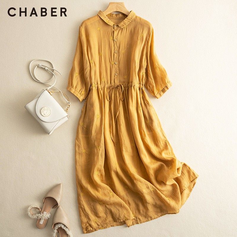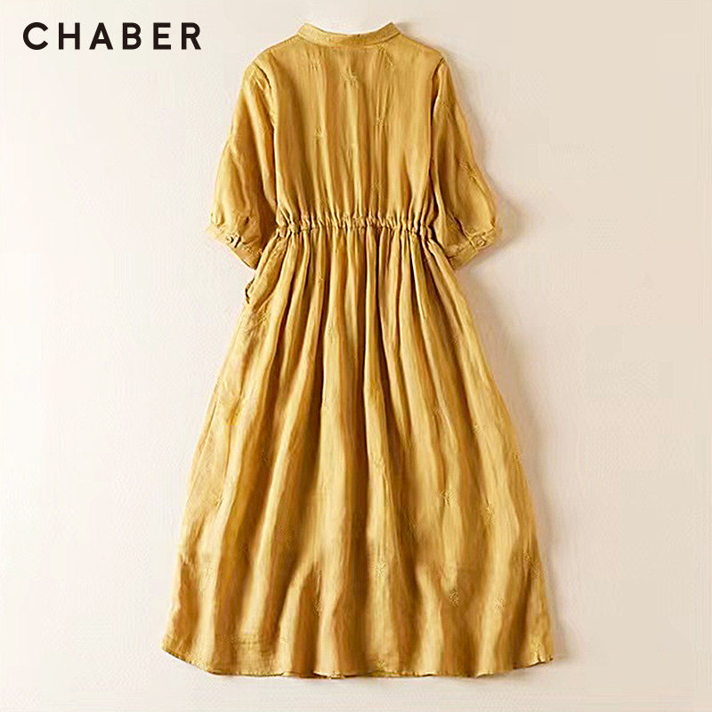 chaber设计感巧帛新品商品显瘦A版七分袖纯色翻领系带长款连衣裙