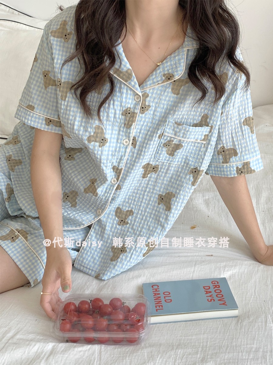 ins风小熊格子睡衣女夏季纯棉薄款短袖短裤两件套学生夏天家居服