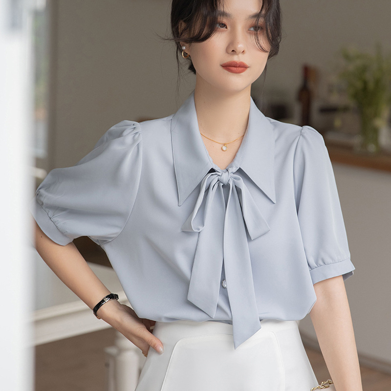 白色雪纺飘带短袖衬衫女夏季设计感小众港风通勤职业百搭系带上衣