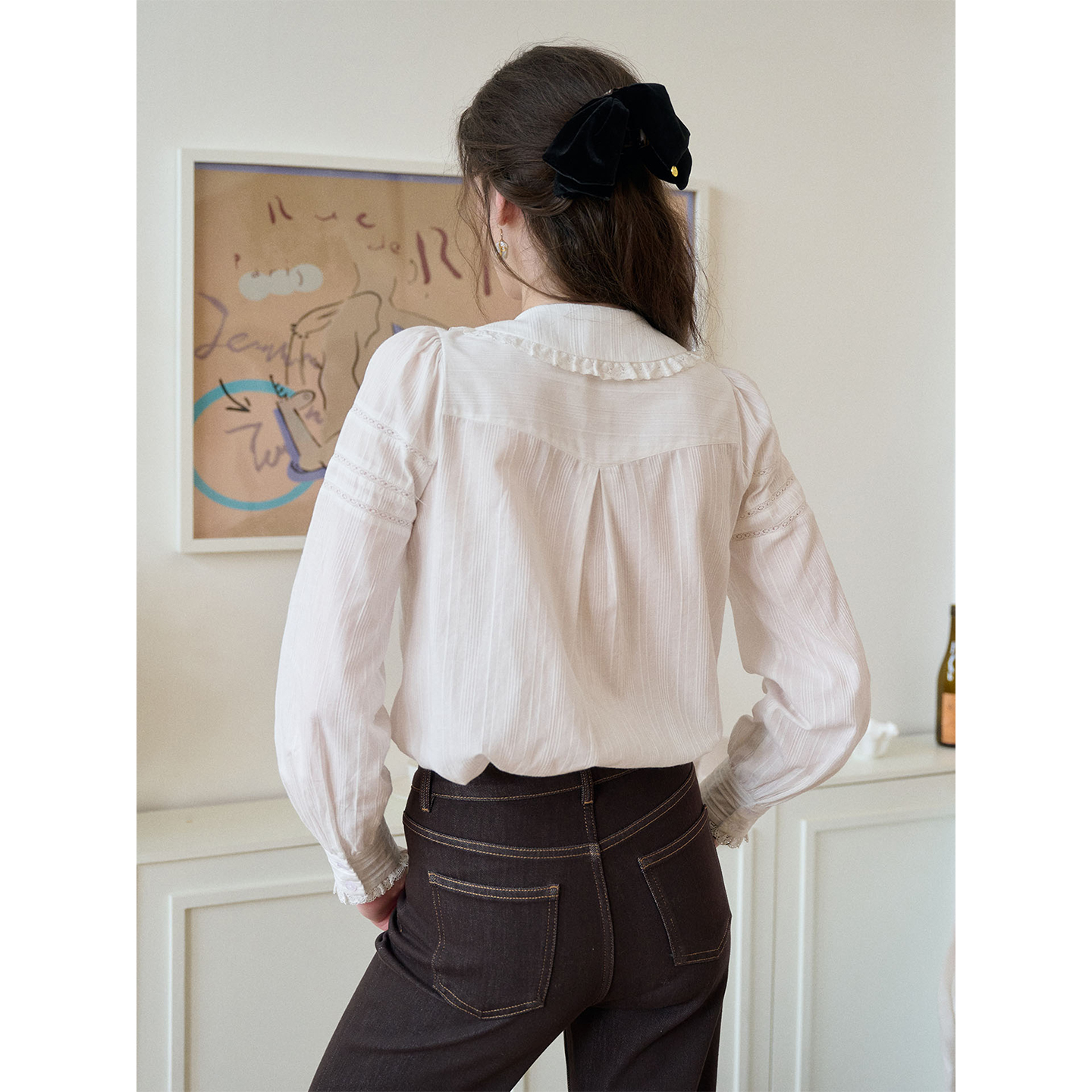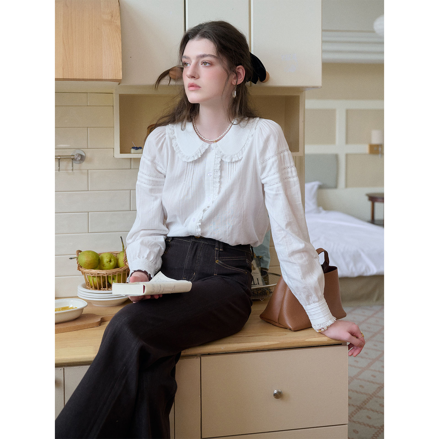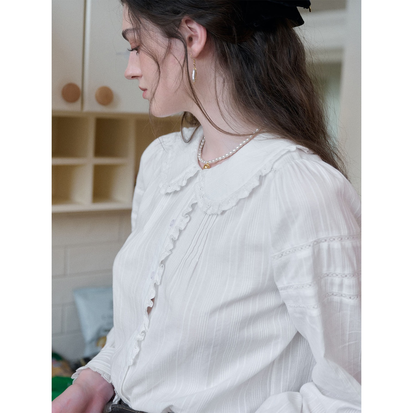SimpleRetro白茶蛋糕 全棉法式娃娃领白色衬衫女秋季气质长袖上衣