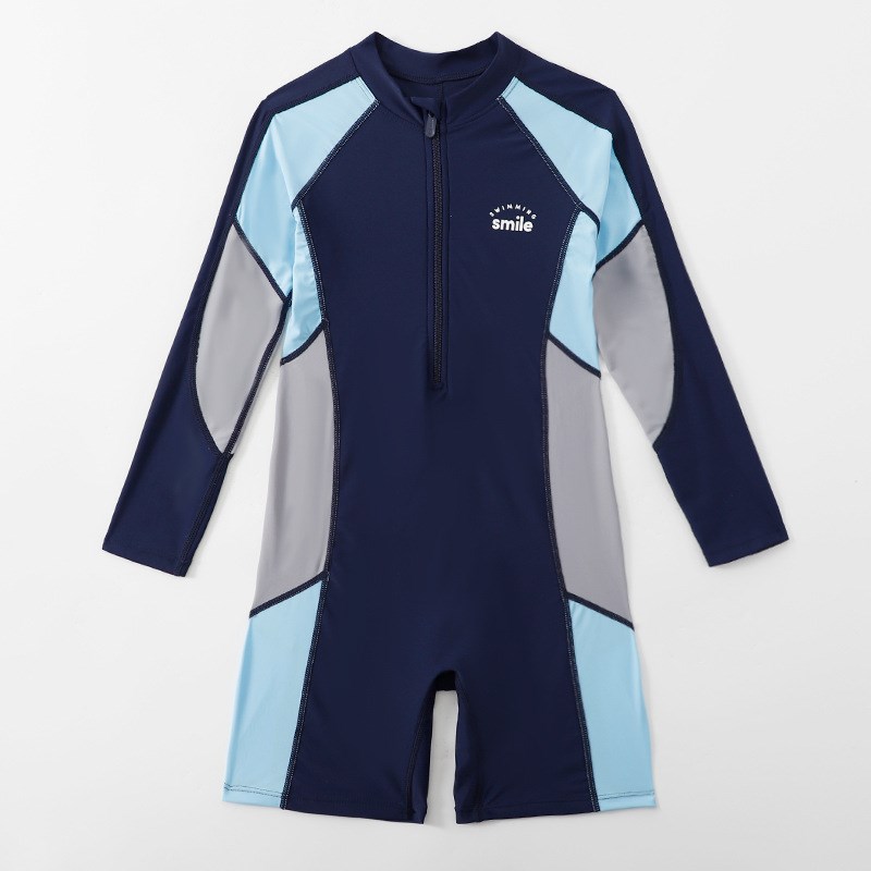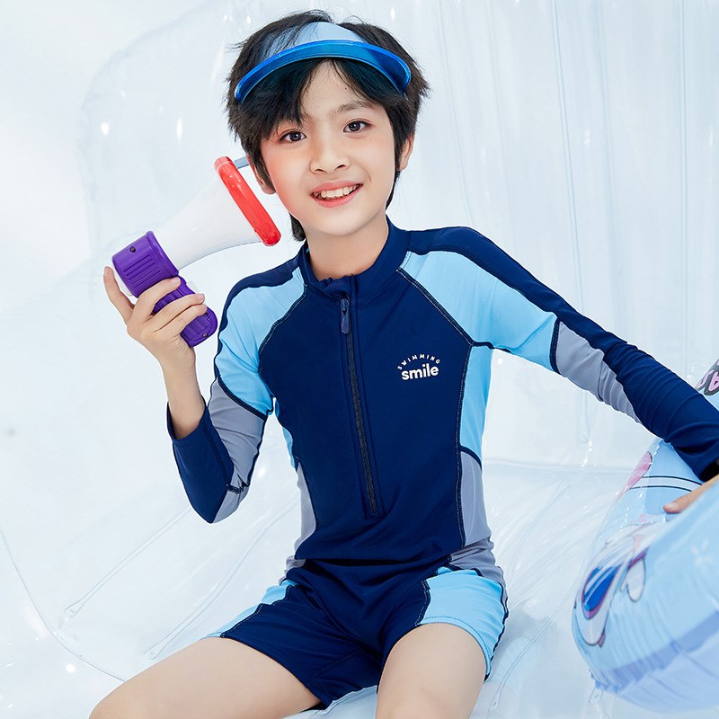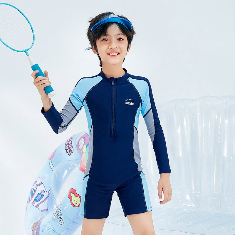 新款儿童泳衣长袖连体平角男女孩中大童大码学生游泳训练防晒速干