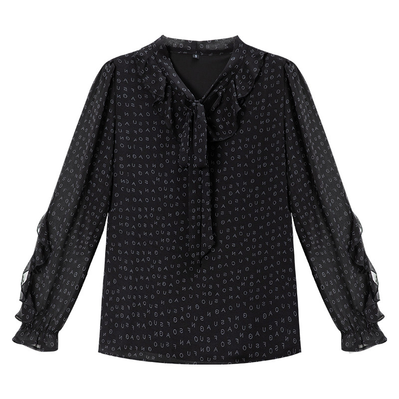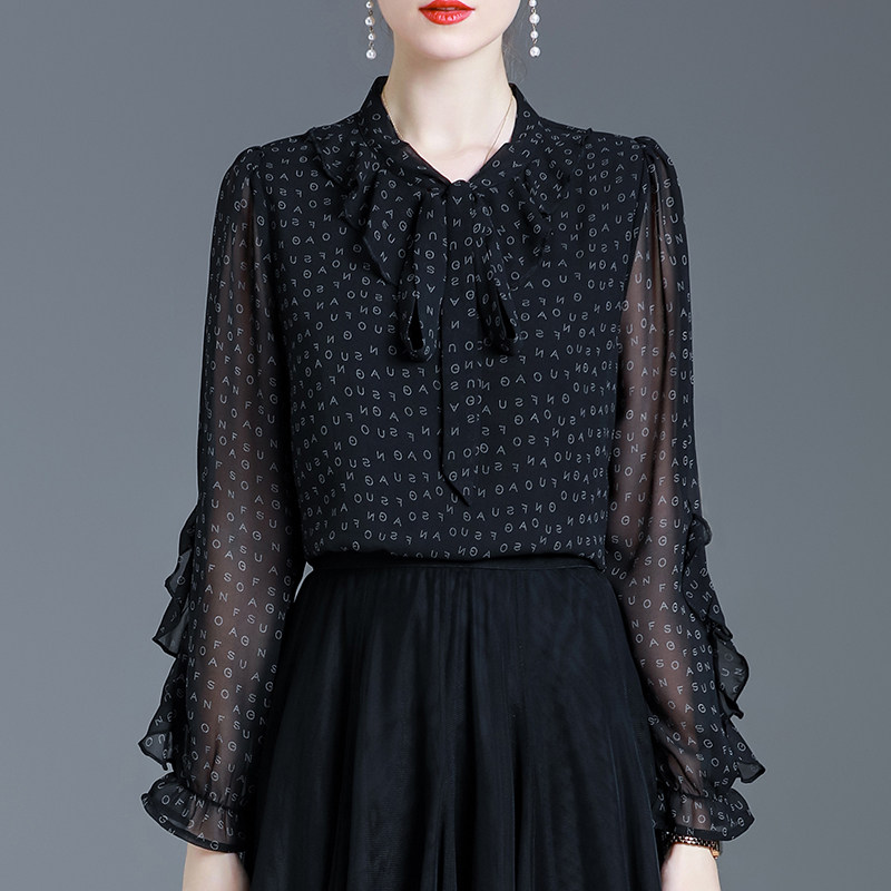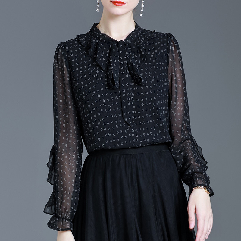 黑色雪纺衫女宽松显瘦内搭外穿印花飘带高端漂亮时尚衬衫法式上衣