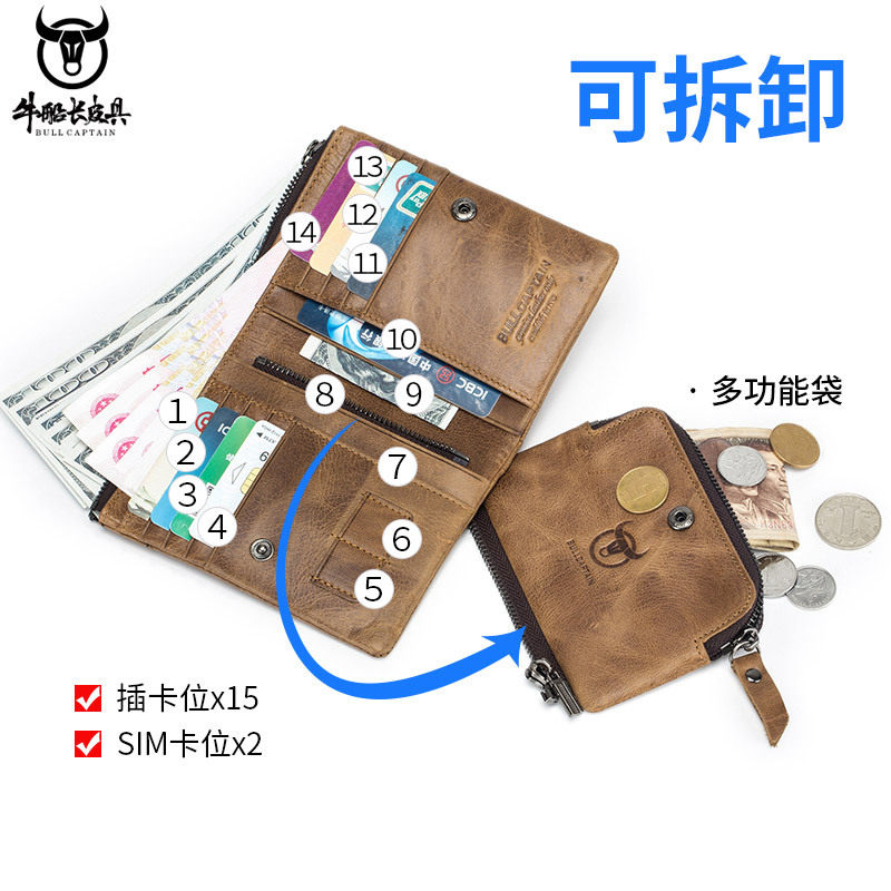 牛船长皮具 真皮复古男士钱包头层牛皮多卡位拆分钱夹零钱包卡包