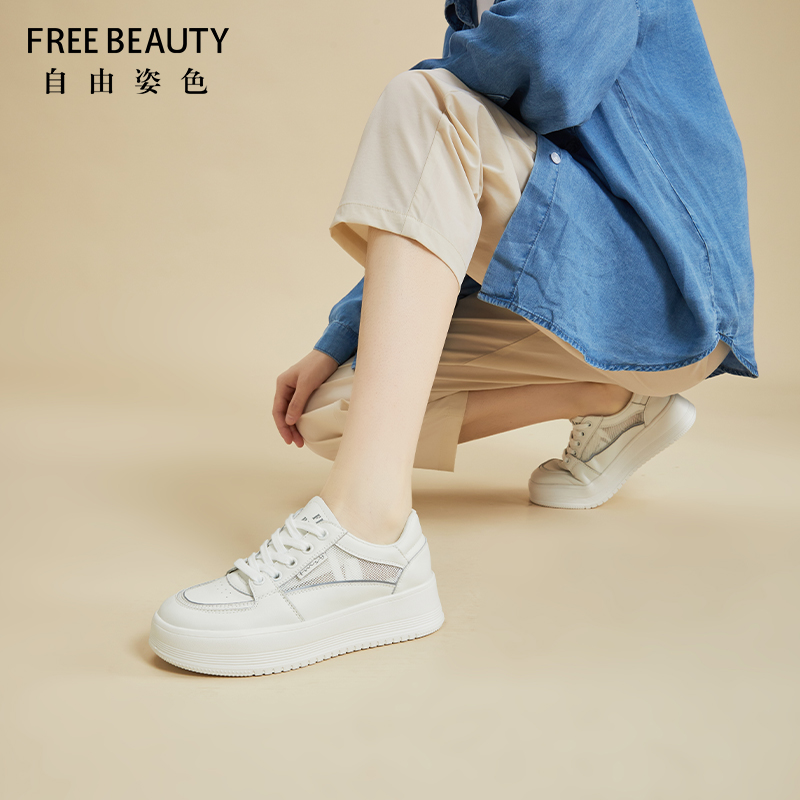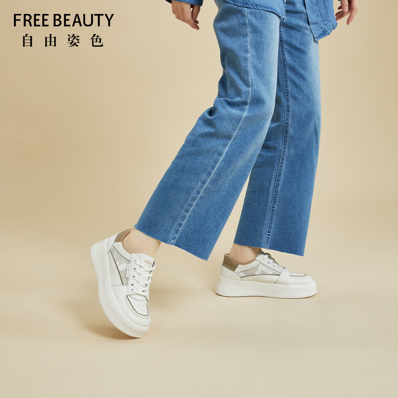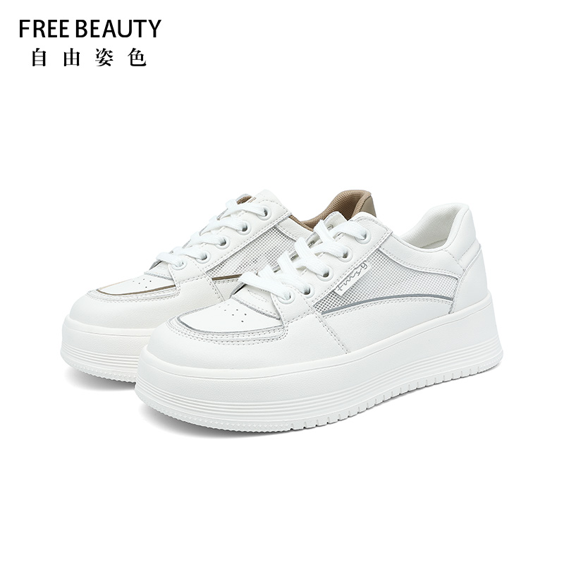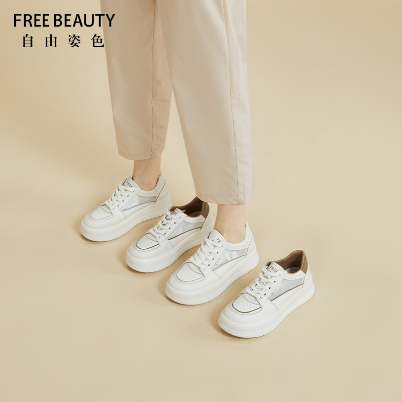 自由姿色小白鞋女厚底春秋季时尚百搭透气网面板鞋拼色系带休闲鞋