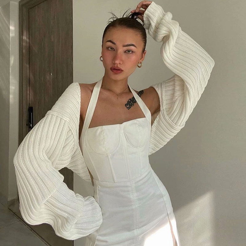 肯豆卡戴珊欧美落肩长袖毛衣纯色针织短外套女士秋冬季上衣披肩