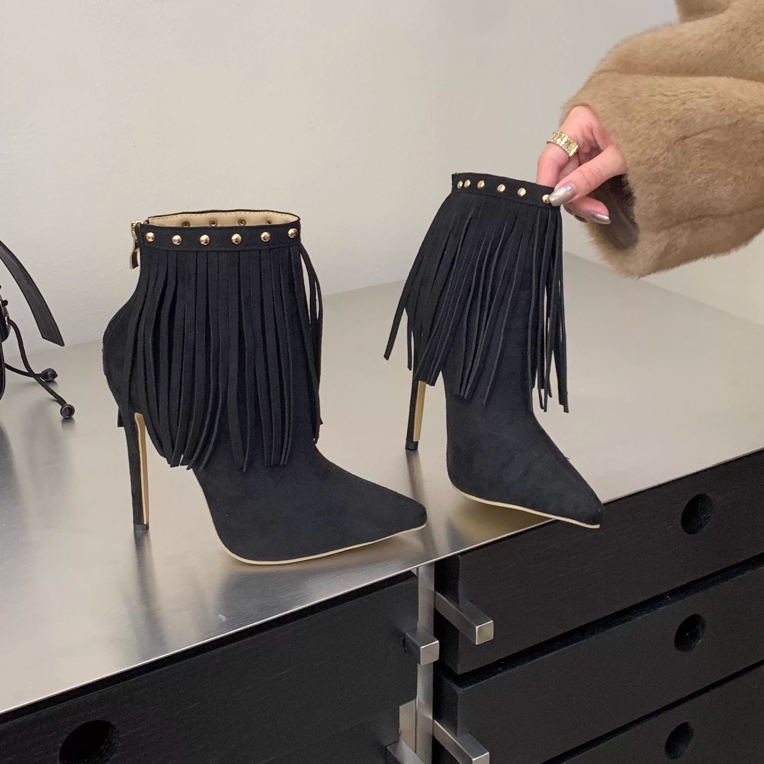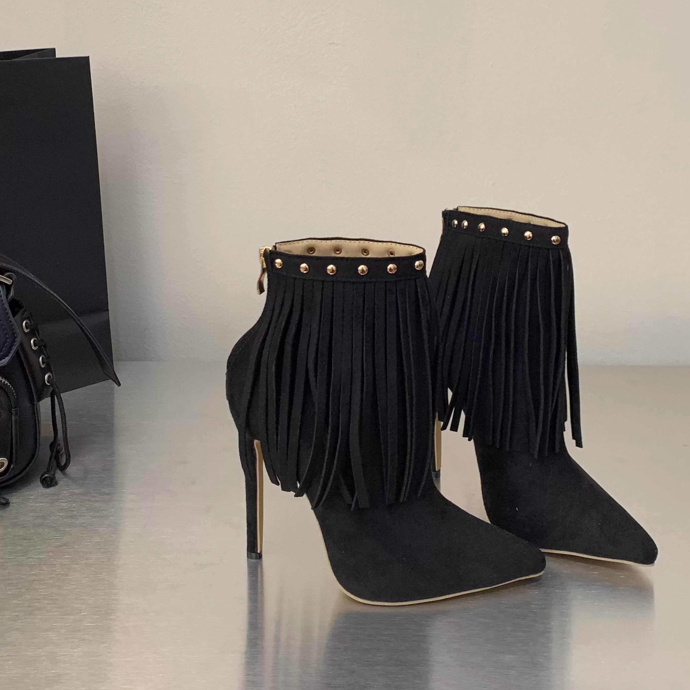 2025年冬季欧美风流苏铆钉尖头高跟短靴女细跟女鞋新款超高跟靴子